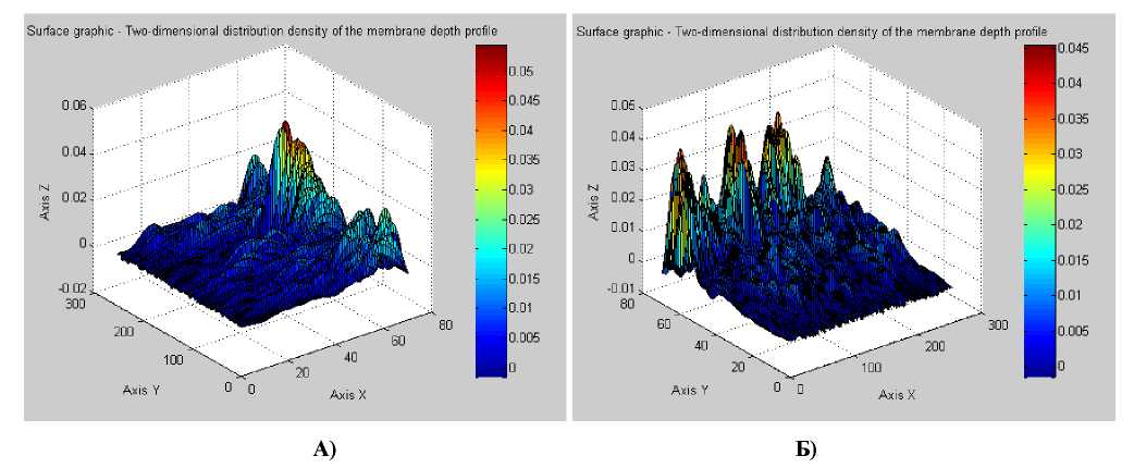 На рис. 3А изображен массив одномерных плотностей распределения глубин пор мембраны по оси X при различных значениях по оси Y. Фактически это двумерная система одномерных плотностей распределения, при этом каждая функция плотности рассчитывается за несколько долей секунд в 70 координатах X при выбранном значении Y На рис. 3Б показана аналогичная система плотностей по оси Y (по X – конкретная координата).