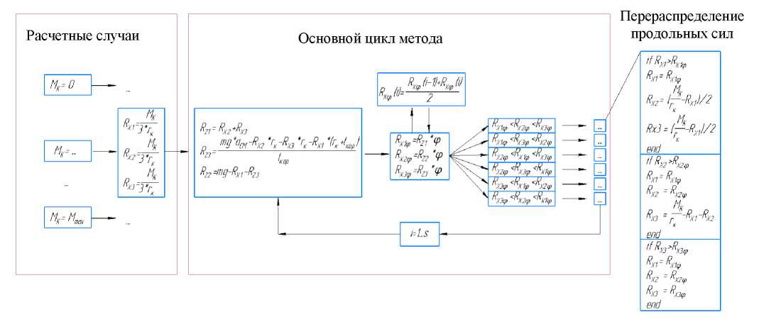 На первом шаге цикла программы принимается, что крутящий момент равномерно распределен по всем продольным силам взаимодействия движителя с опорным основанием. Затем вычисляются значения нормальных реакций и максимально возможных реализуемых сил RXφ, причем для лучшей сходимости метода для дальнейших вычислений используются не новые значения RXφ, а средние между новыми значениями и значениями с предыдущего шага (рис. 3-6). Дальнейший расчет производится после сортировки полученных значений RXφ по возрастанию и исходя из текущего случая и этапа преодоления препятствия (рис. 3-6).