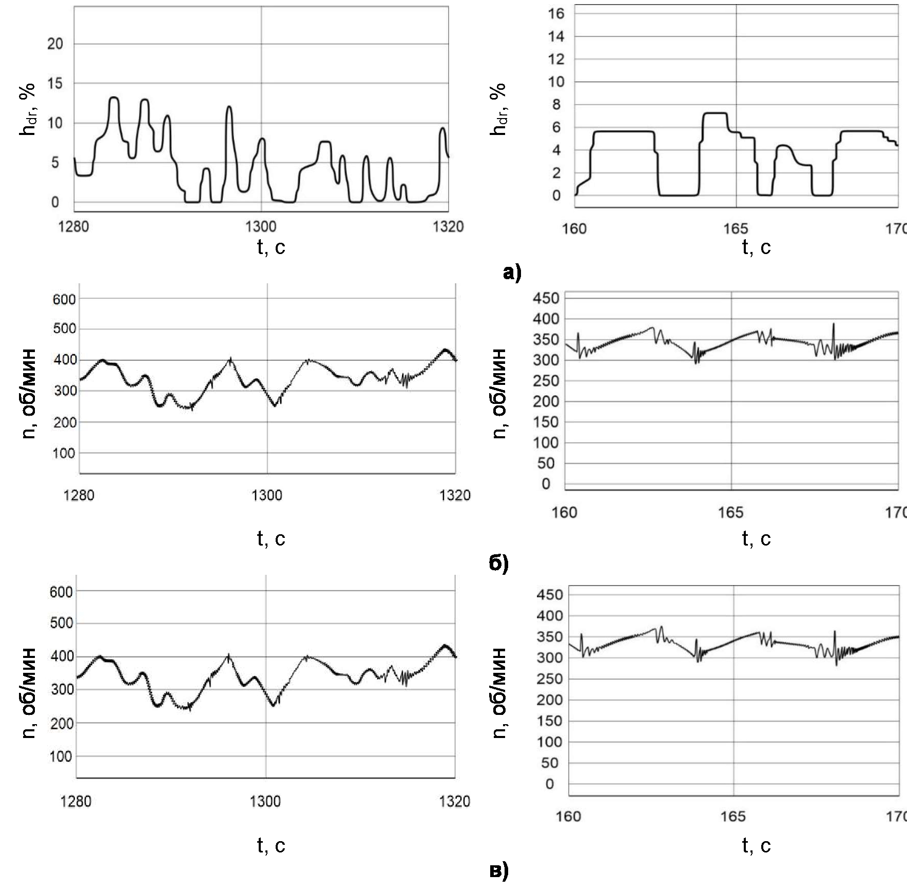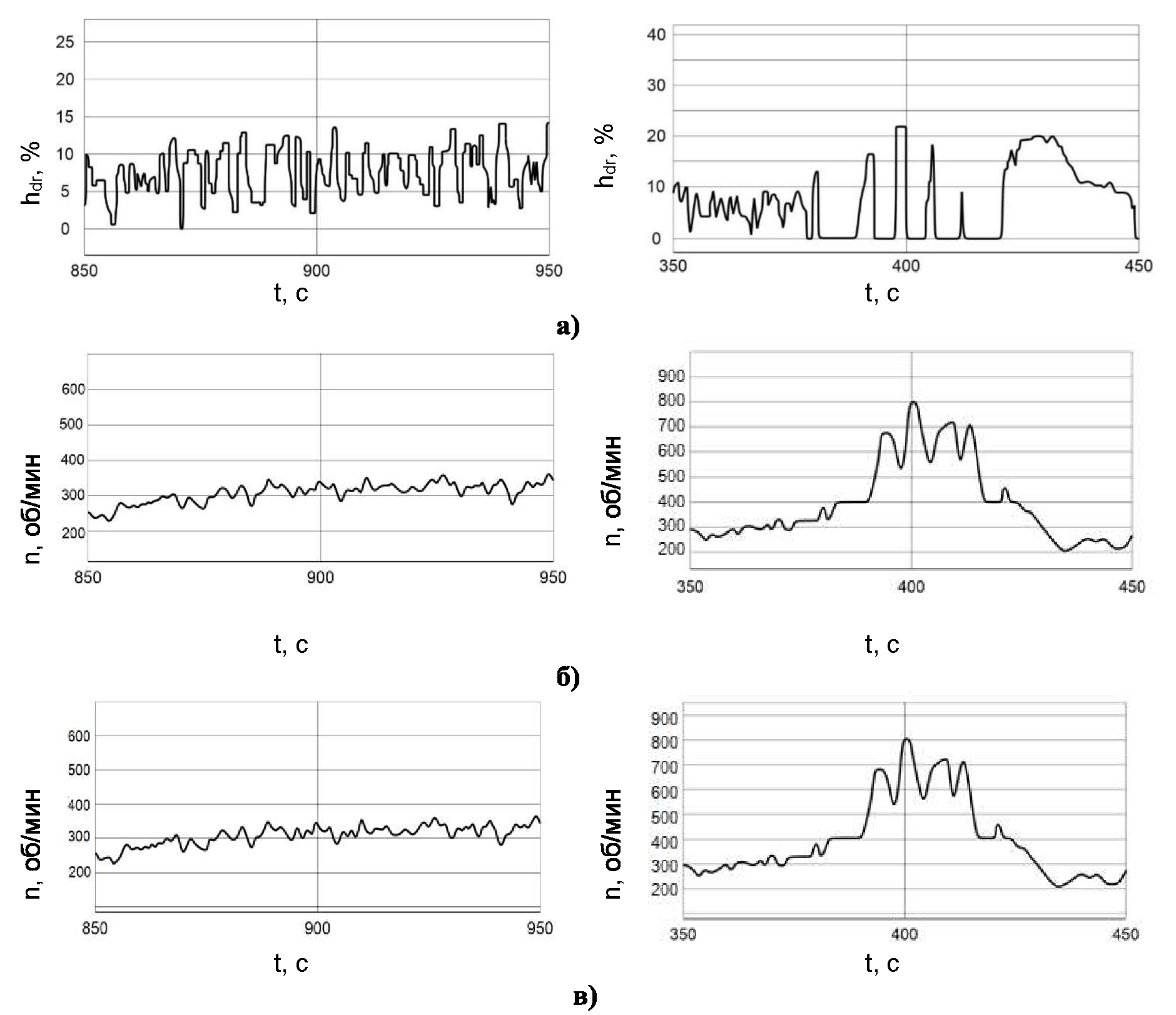 6. Fig. 5. Realizations of the position of the accelerator pedal and the rotation frequencies of traction electric motor rotors with an S-shaped dependence of torque settings (left – fragment 1; right – fragment 2): a) the position of the accelerator pedal, %; b) rotation frequency of the rotor of the left electric motor, rpm; c) rotation frequency of the rotor of the right electric motor, rpm
