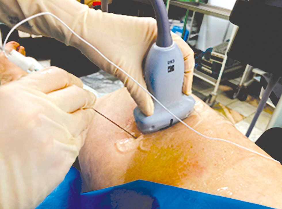 Рис. 1. Модифицированная методика выполнения iPACK-блока (вкол осуществляется с медиальной стороны и снизу относительно датчика, отступая 1–2 см книзу от датчика)