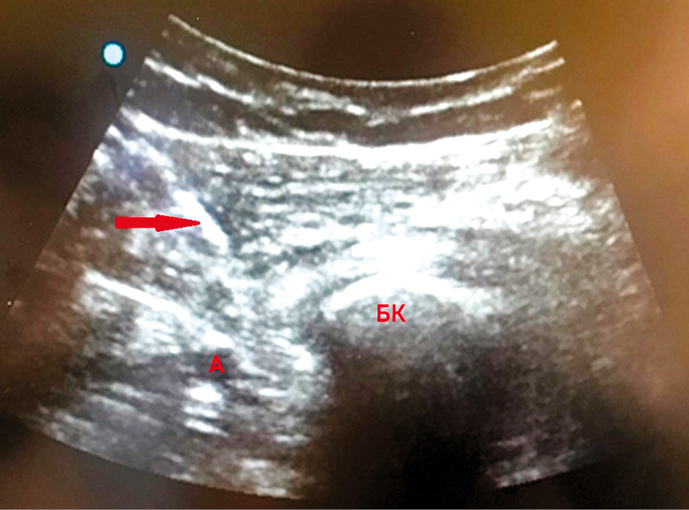 Рис. 2. Ультразвуковое изображение выполнения iPACK-блока (направление иглы сверху вниз под углом 45° по направлению к мыщелку бедренной кости (БК), к пространству, располагающемуся между мыщелками БК и подколенной артерией (А), инфильтрация производится по ходу движения иглы, с основным введением раствора между подколенной артерией и мыщелками бедренной кости)