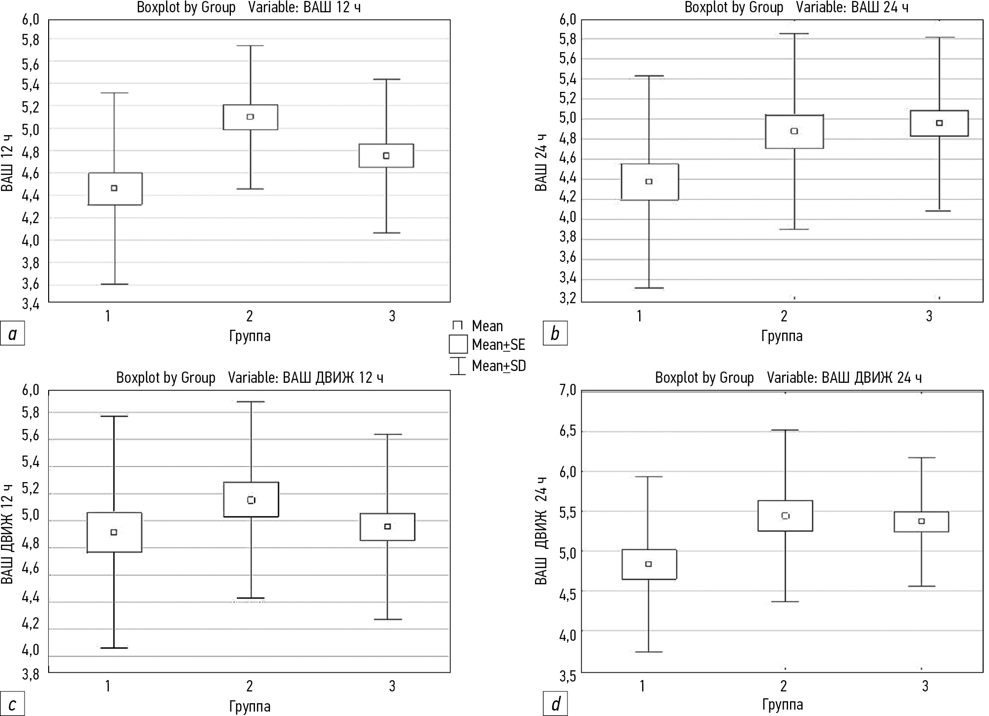 Рис. 3. Динамика болевого синдрома в группах в покое и при движении (a – болевой синдром в покое по ВАШ через 12 ч после операции; b – болевой синдром в покое по ВАШ через 24 ч после операции; c – болевой синдром при сгибании коленного сустава по ВАШ через 12 ч после операции; d – болевой синдром при сгибании коленного сустава по ВАШ через 24 ч после операции)
