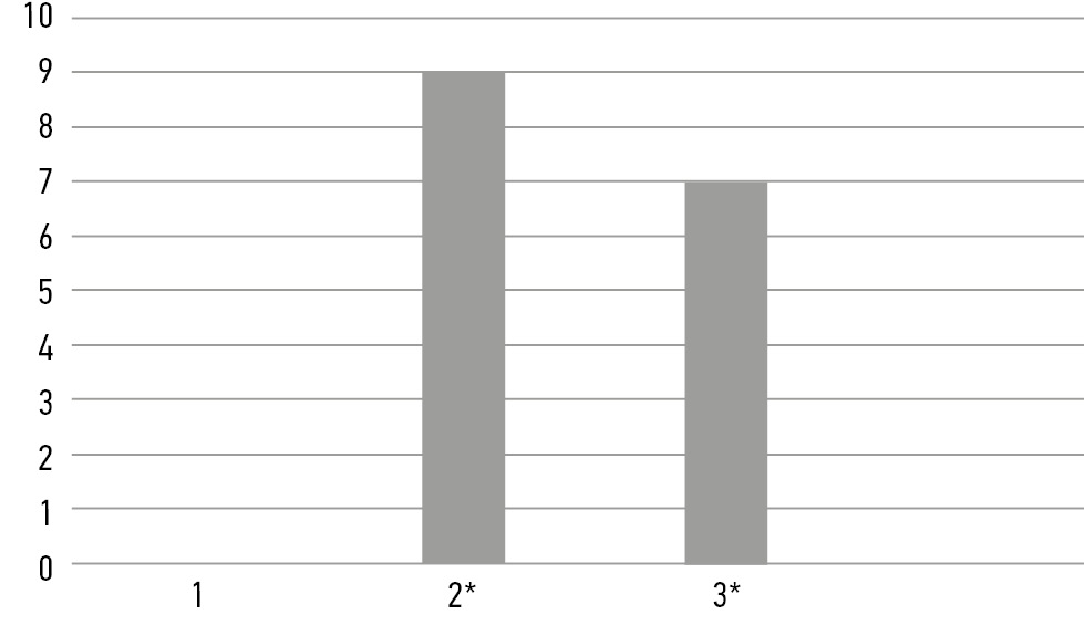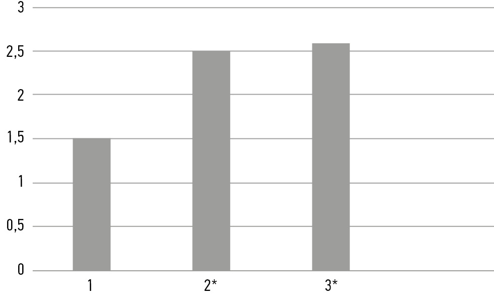 Fig. 5. Comparison of the motor block in groups according to the Bromage scale (1 – group IPACK+ACB, 2 – group with femoral nerve block, 3 – group IPACK+femoral nerve); (*p ≤0.05 – compared with group 1)