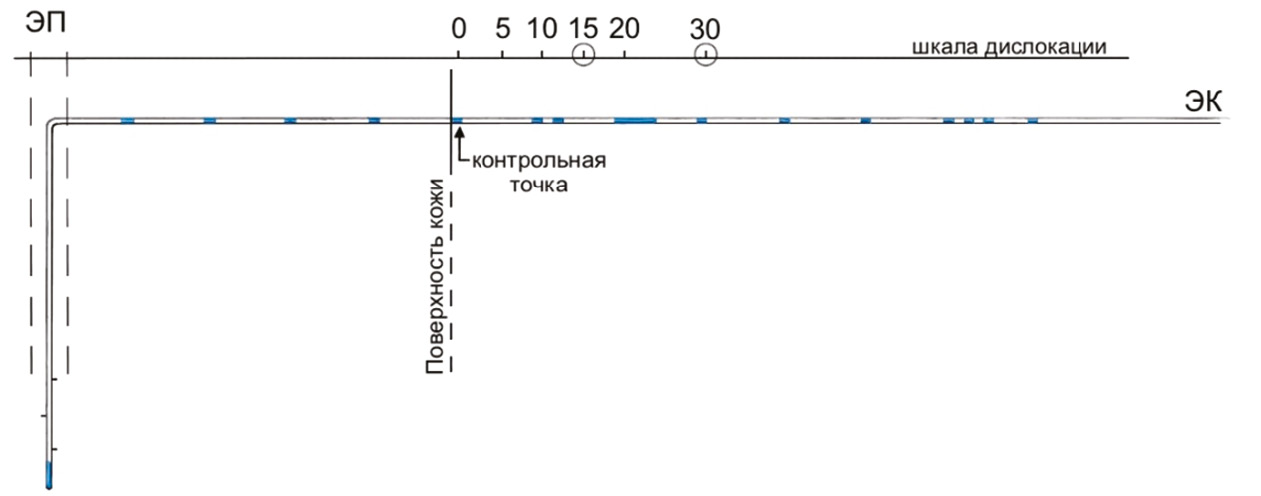 Fig. 3. Dislocation of the 2nd and 3rd degree, which does not lead to a deterioration in the quality of anesthesia. ЭП – epidural space, ЭК – epidural catheter