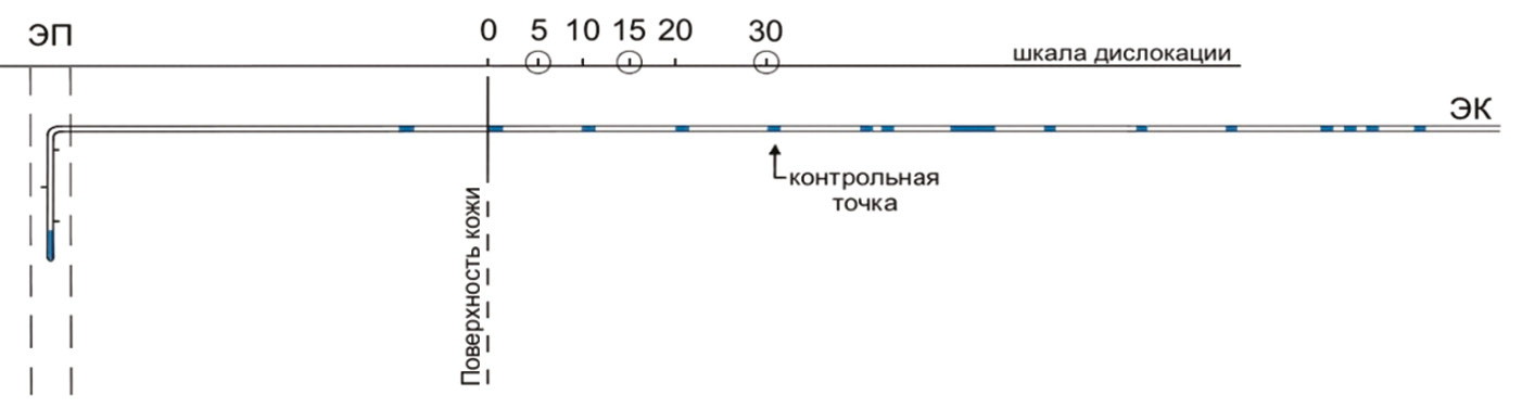 Для наглядности степень дислокации эпидурального катетера представлена на рисунках 2–5. 1-я степень дислокации (0–5 мм) и 2–3-я степени дислокации (от 5 до 15 мм) не приводят к ухудшению качества обезболивания. 4-я и 5-я степени дислокации (от 15 до 30 мм) сопряжены с высокой вероятностью ухудшения качества проводимого обезболивания и требуют повышенной настороженности при уходе за эпидуральным катетером дополнительной фиксацией. 6-я степень дислокации (более 30 мм) – это полная дислокация или выпадение эпидурального катетера.