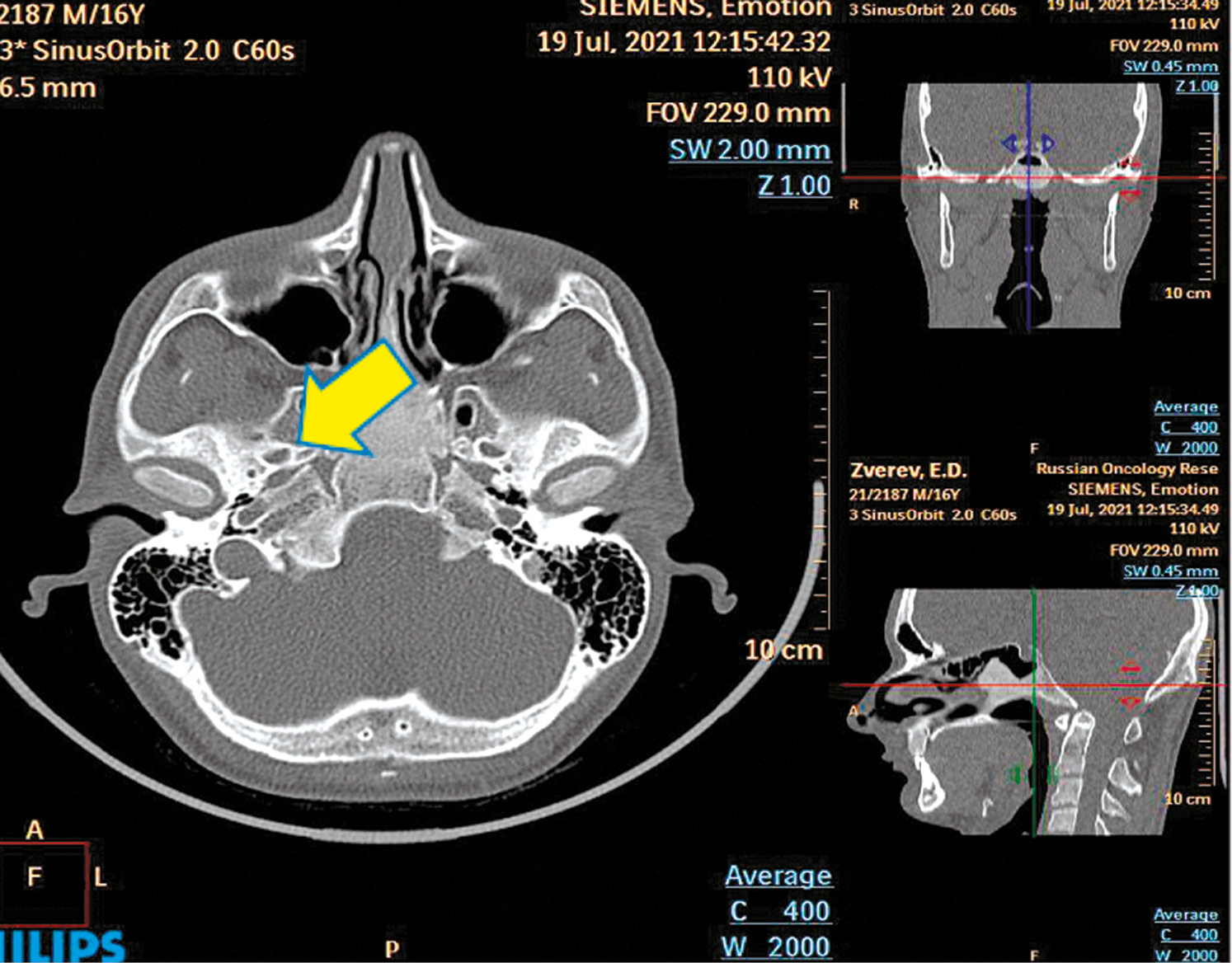 На компьютерной томографии лицевого скелета с контрастированием видно, что в средних отделах основной пазухи определяется объёмное образование с достаточно ровными контурами костной плотности, неоднородной структуры в виде утолщения перегородки основной пазухи, клиновидного гребня, решетчатой кости. Контрастное вещество не накапливает, деструктивных и периостальных изменений в других костях черепа не выявлено. Размер образования 3,2×1,7×3,6 мм. РКТ-картина соответствует фиброзной дисплазии клиновидной кости (рис. 1).