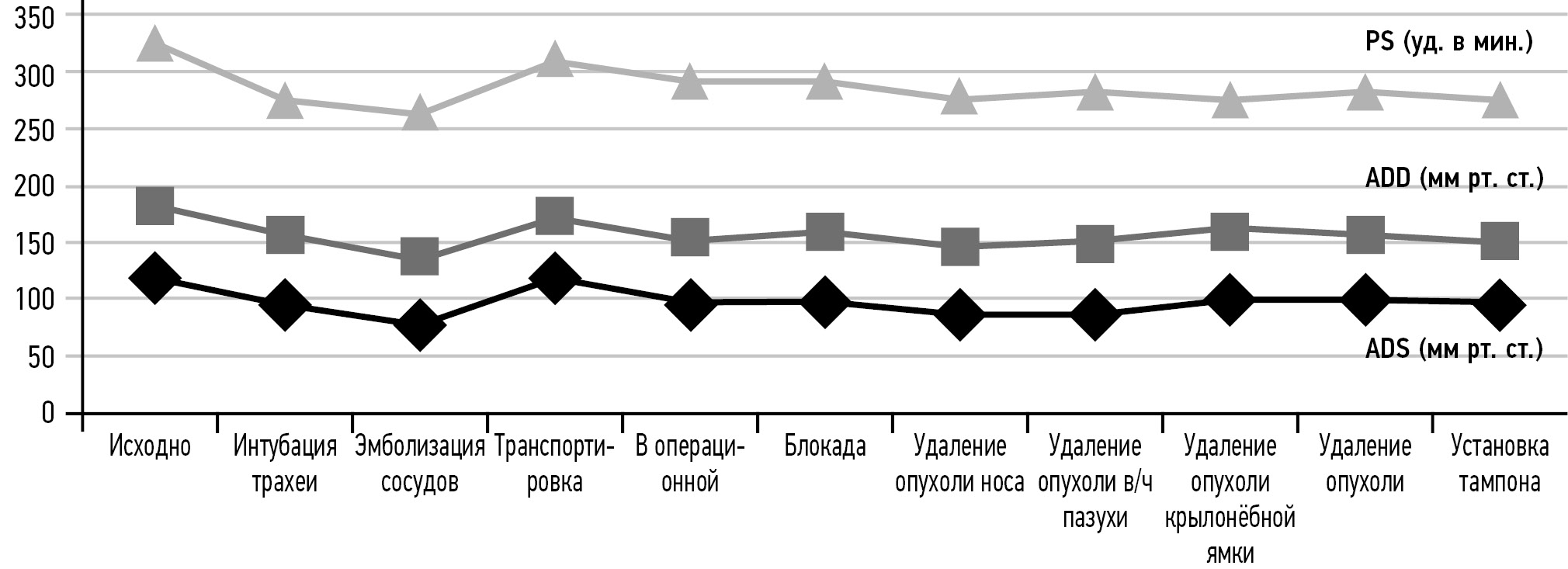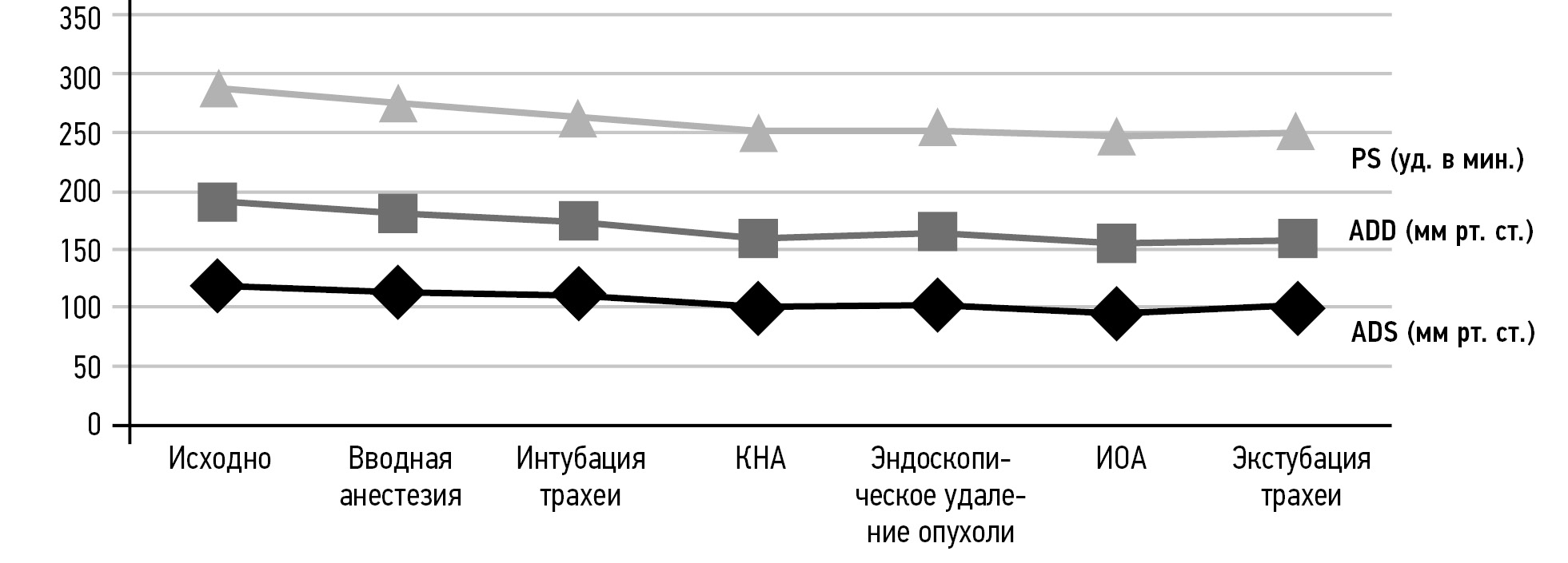 Гемодинамическая картина по ходу анестезии стабильная (рис. 7). При поступлении в операционную показатели гемодинамики соответствовали исходным данным в палате. Начиная с этапа индукции, далее по ходу интубации трахеи и при эмболизации сосудов опухоли отмечалось снижение показателей артериального давления систолического и диастолического, пульса (ADS, ADD, PS), что связано с особенностями фармакокинетики севофлурана и пропофола, обуславливающих более длительное остаточное депрессивное влияние анестетика и гипнотика на сердечно-сосудистую систему, и продолжающееся до этапа транспортировки пациента из отделения рентгеноангиографии после эмболизации сосудов опухоли. При этом на всех этапах наблюдения отклонений от возрастных нормативов параметров гемодинамики не отмечено.