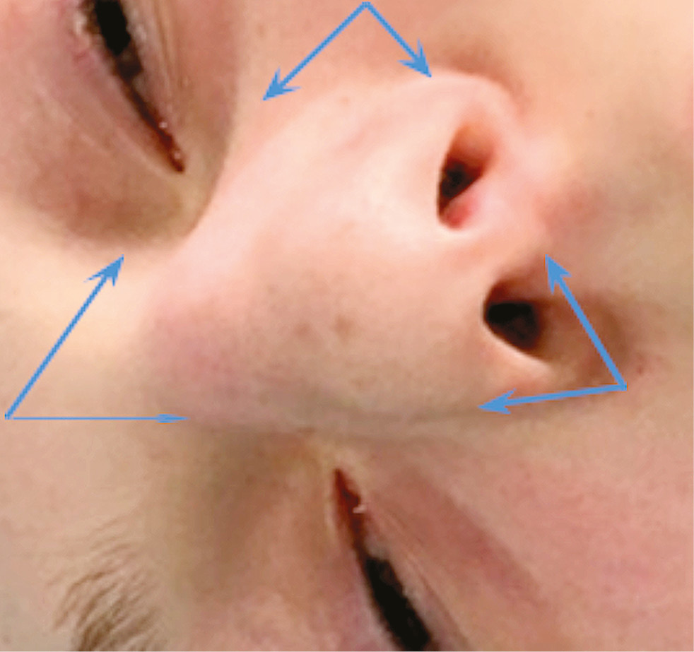 Рис. 8. Инфильтрационная анестезия носа по Вайсблату из трёх точек / Fig. 8. Infiltration anesthesia of the nose by Weissblatt from three points