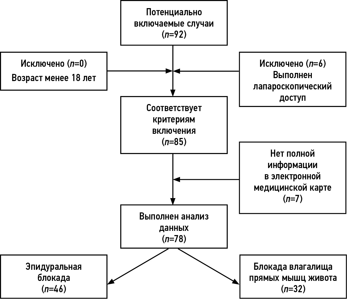 После отбора в исследование включили данные 78 пациентов. Больных разделили на 2 группы: 1-я группа (n=46) — пациенты, которым в послеоперационном периоде использовали эпидуральную аналгезию местным анестетиком; 2-я группа (n=32) — больные, которым выполняли послеоперационную аналгезию введением раствора местного анестетика в катетеры влагалищ прямых мышц живота (рис. 1).