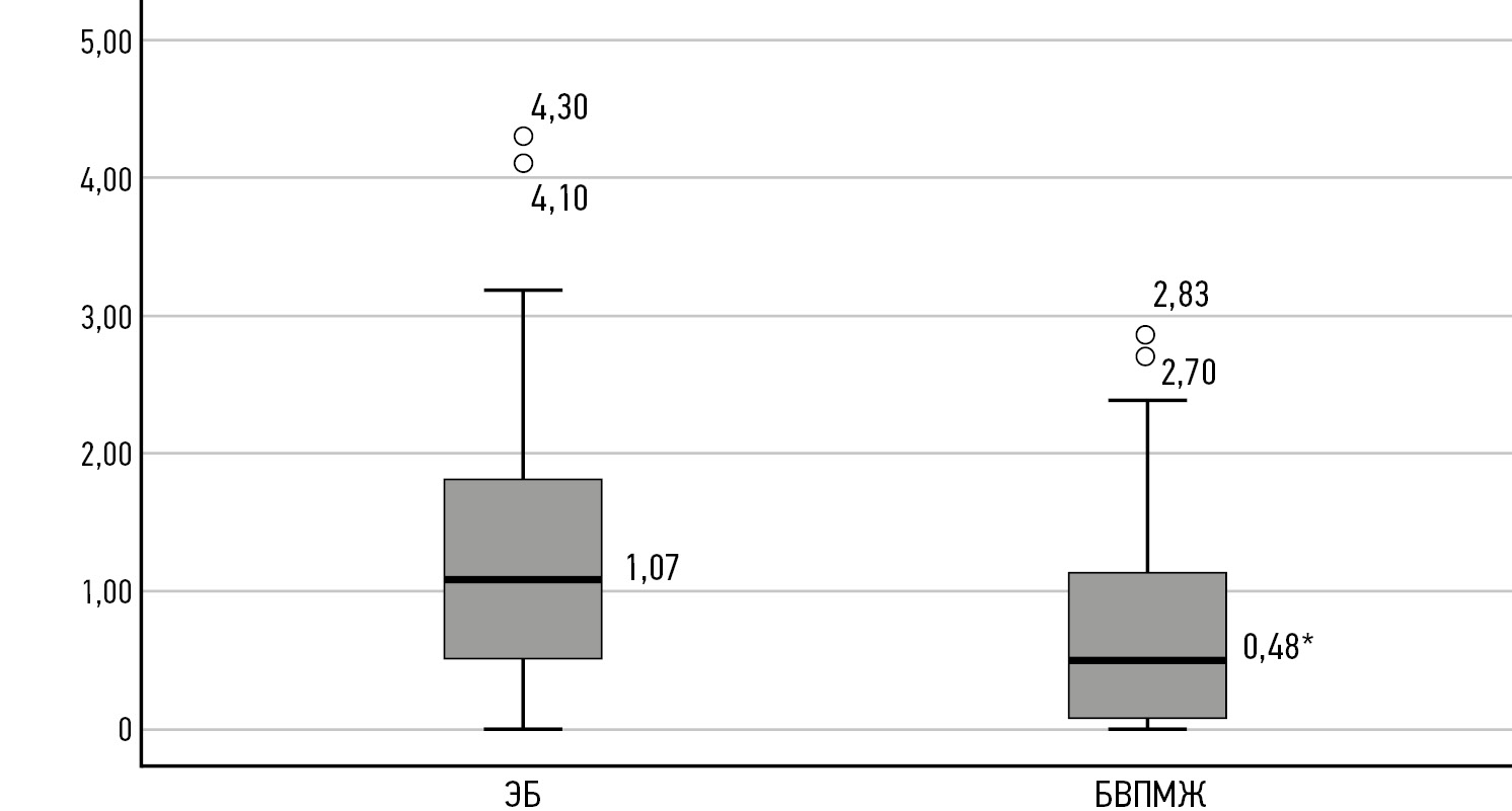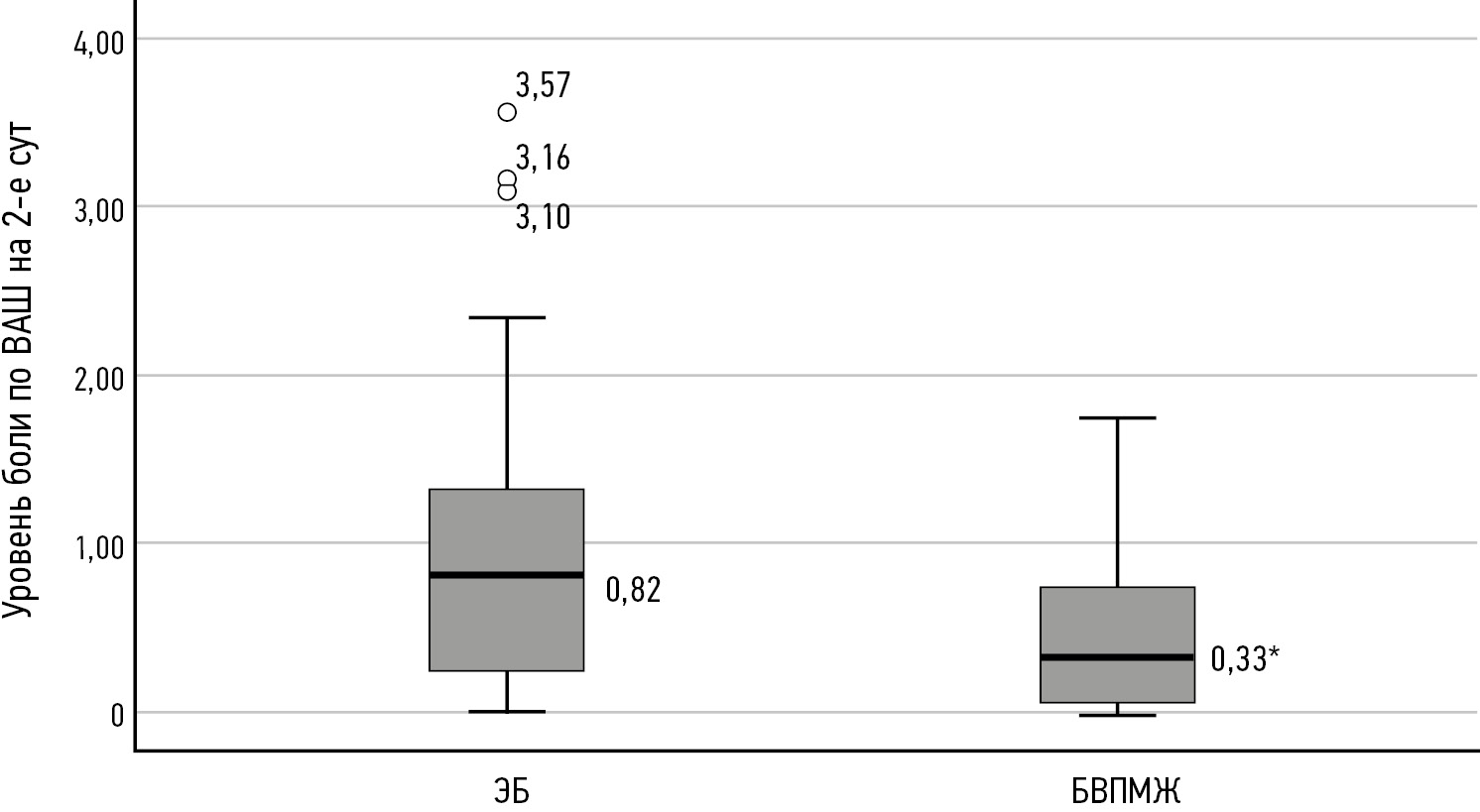 При сравнении степени выраженности болевого синдрома по ВАШ после операций при ЭБ уровень болевых ощущений оказался существенно выше по сравнению с БВПМЖ: в 1-е сут — 1,07 и 0,48 см по ВАШ соответственно (р=0,013), на 2-е сут — 0,82 и 0,33 см по ВАШ соответственно (р=0,021). На 3-и сут после вмешательства уровень боли по ВАШ значимо не различался (р=0,060). Данные представлены на рис. 2 и 3.