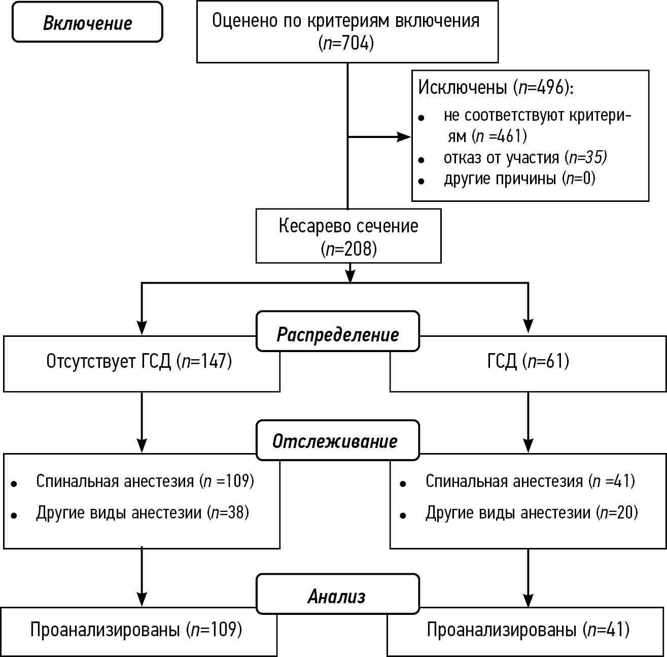 ГСД увеличивает частоту кесарева сечения до 57,4% и оказывает негативное влияние в случаях ожирения и/или КС в анамнезе [10–16]. В то же время хронический высокий уровень глюкозы в плазме крови может влиять на опиоидные рецепторы, тем самым изменяя фармакокинетику и фармакодинамику опиоидов [17]. Кроме того, хронический высокий уровень глюкозы может воздействовать на метаболизм нейромедиаторов [18–21]. Исследования C. Yang и соавт. показали, что беременные с ГСД нуждаются в большем количестве анальгетиков и демонстрируют более высокое потребление опиоидов в ближайшем послеоперационном периоде после КС, чем пациентки без ГСД [22]. При родоразрешении путём КС рекомендованы как методы нейроаксиальной, так и общей анестезии, однако преобладание спинальной анестезии (СА) во время операции КС неоспоримо [23–26]. Таким образом, у рожениц с ГСД остаются не до конца изученными особенности течения СА во время операции КС, а также течение послеоперационного периода.