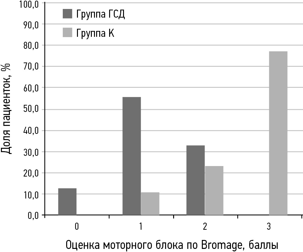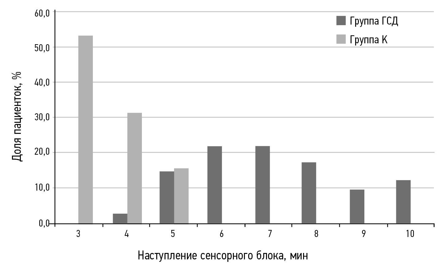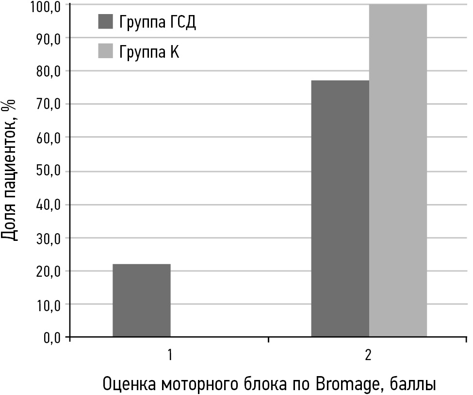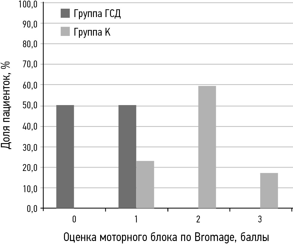 Результаты. Cенсорный блок через 3 мин был достигнут у 53٪, через 4 мин — у 84%, через 5 мин — у всех пациенток контрольной группы. В группе пациенток с ГСД порог 50٪ был достигнут через 7 мин, у всех 100% пациенток сенсорный блок отмечен через 10 мин. Оценка моторного блока по Bromage через 5 мин показала, что в контрольной группе он развился у всех пациенток, в то время как в группе пациенток с ГСД — у 77,5% женщин.
