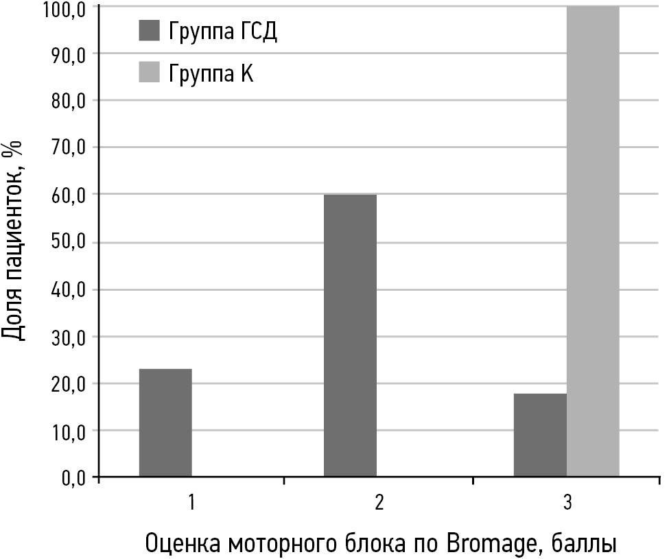 Через 2 мин после интратекального введения анестетика у 50% пациенток группы с ГСД моторный блок не развился, у второй половины получена оценка B1. В контрольной группе: B1 — у 22,9%, B2 — у 59,6%, B3 — у 17,4% наблюдаемых.