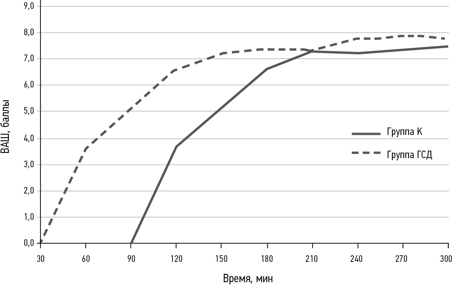 Оценка по ВАШ через 30 мин после операции оказалась равной 0 в обеих группах. Значимые болевые ощущения (>5 баллов) в группе с ГСД определялись через 90 мин, в то время как такую оценку в группе без ГСД получили через 150 мин (рис. 7).