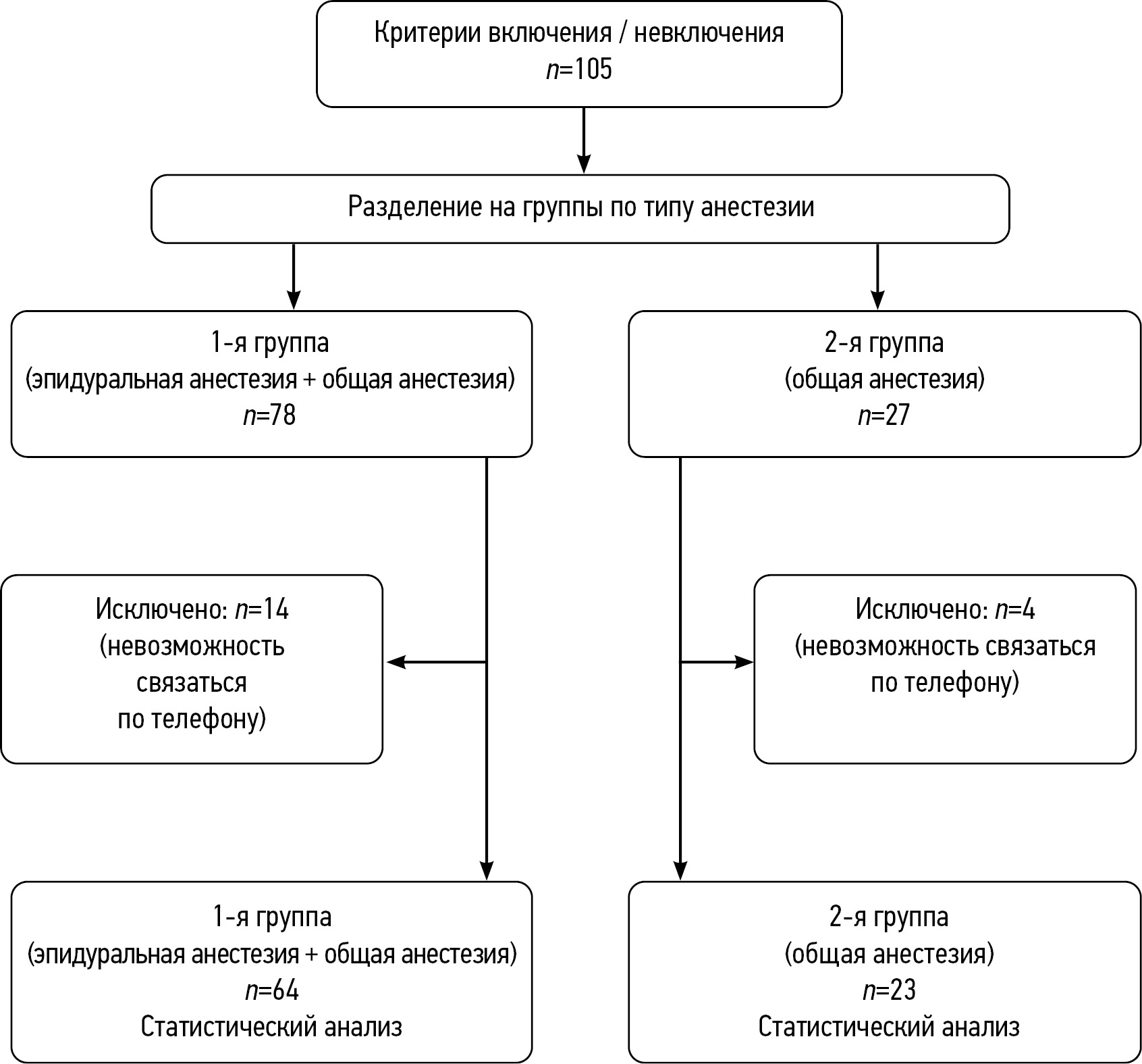 После анализа учётной медицинской документации в когортную группу нами были отобраны 105 пациентов кардиохирургических отделений, которым проводили операцию MIDCAB. По типу анестезиологического обеспечения выполненных операций пациентов разделили на 2 группы. В 1-ю группу включили 78 пациентов, которым для анестезиологического обеспечения этих операций применялась сочетанная анестезия: эпидуральная анестезия на уровне ThIV с использованием катетерной техники и введением за полчаса до начала операции в эпидуральное пространство 20 мл 0,5% раствора ропивакаина + общая комбинированная с использованием 0,9–1,1 МАК (МАК — минимальная альвеолярная концентрация) севофлурана и фентанила. В раннем послеоперационном периоде в 1-й группе для обезболивания использовали пролонгированную инфузию в эпидуральное пространство 0,2% раствора ропивакаина + болюсное внутривенное введение нестероидных противовоспалительных препаратов (НПВП). Во 2-ю группу вошли 27 человек, которым в качестве анестезиологического обеспечения операций применяли только общую комбинированную анестезию (0,9–1,1 МАК севофлурана и фентанил), а аналгезия в раннем послеоперационном периоде основывалась на парентеральном болюсном введении НПВП и промедола.