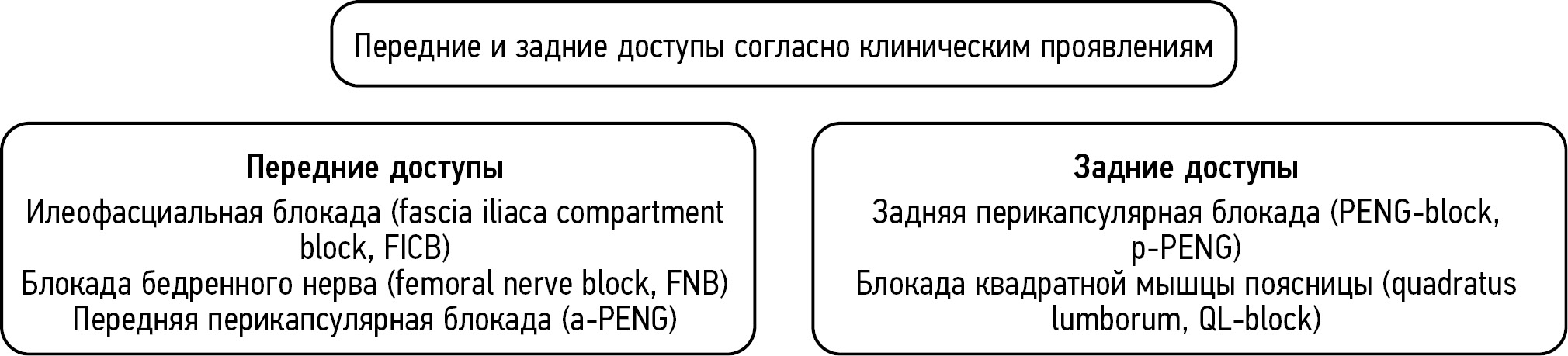 Из недавно разработанных задних анальгетических доступов к ветвям поясничного сплетения наиболее популярны блокада квадратной мышцы поясницы (QL-block) и блокада мышцы, выпрямляющей позвоночник (ESP-block) [13]. В зависимости от клинических проявлений и преобладающего болевого синдрома (например, передней боли при импиджмент-синдроме, задней боли при задней дисплазии ТБС, мышечной гематоме) могут применяться различные технологии обезболивания. Задние доступы менее удобны для позиционирования больного с переломом бедра и интенсивным болевым синдромом. Из передних доступов наиболее эффективна илеофасциальная блокада, которая позволяет выполнить предоперационную подготовку и транспортировку пациента в комфортных для него условиях, что значительно снижает выраженность стрессовой реакции на травму и боль. Супраингвинальная илеофасциальная блокада обусловливает анальгетический эффект в зоне иннервации бедренного, запирательного и бокового кожного нервов бедра при введении большого объёма местного анестетика в низкой концентрации [12, 14] Анальгетичеcкий эффект вполне сопоставим с блокадой поясничного сплетения задним доступом (psoas compartment block). Особенно важно то, что не требуется специальное позиционирование пациента с болевым синдромом, и она может быть выполнена в положении лёжа на спине и значительно проще технически. Тактика выбора плоскостного блока в зависимости от преобладания передней или задней боли представлена на рис. 2.