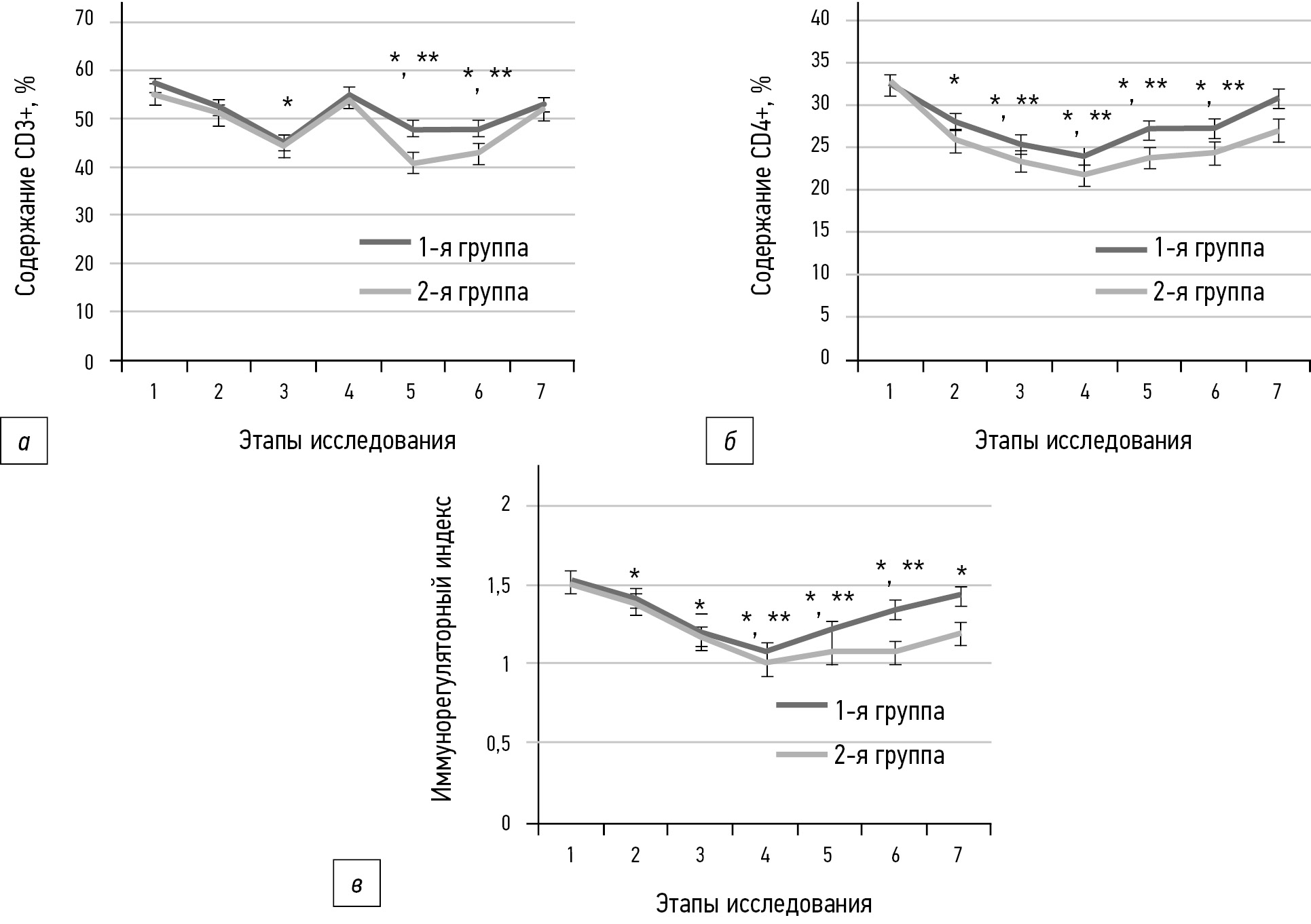 Рис. 2. Динамика изменения содержания Т-клеток CD3+ (а), CD4+ (б) и иммунорегуляторного индекса (в) в периоперационном периоде. Примечание (здесь и на рис. 3). 1-я группа — эпидуральная аналгезия, 2-я группа — внутривенное введение анальгетиков. Этапы исследования: 1 — перед анестезией; 2 — через 90 мин после начала операции; 3 — сразу после окончания операции; 4 — 1-е сут; 5 — 2-е сут; 6 — 3-е сут; 7 — 9-е сут послеоперационного периода. * р <0,05 — по сравнению с исходными данными, ** р <0,05 — по сравнению со 2-й группой. / Fig. 2. The level of T-cells CD3+ (a), CD4+ (б) and CD4+/CD8+ (в) in the perioperative period. Note (here and in Fig. 3). 1-я группа — epidural analgesia, 2-я группа — intravenous administration of analgesics. Stages of the study: 1 — before anesthesia; 2 — 90 min after the start of the operation; 3 — immediately after the end of the operation; 4 —1st day; 5 — 2nd day; 6 — 3rd day; 7 — 9th day of the postoperative period. * р <0.05 — compared with the original data, ** р <0.05 — compared with the 2nd group.