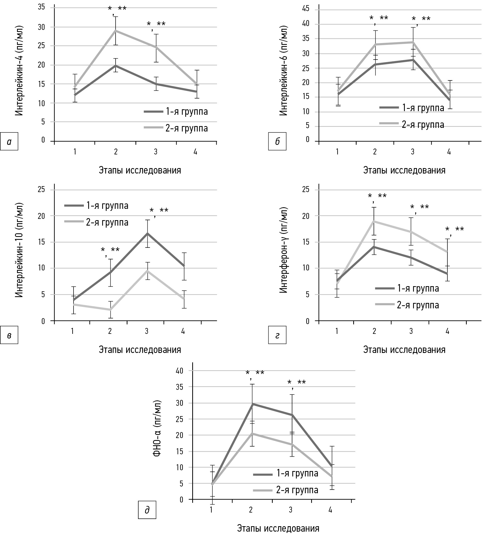 Рис. 3. Изменение содержания IL-4 (а), IL-6 (б), IL-10 (в), IFN-γ (г) и TNF-α (д) у обследованных пациентов в послеоперационном периоде. / Fig. 3. Change in the content of IL-4 (a), IL-6 (б), IL-10 (в), IFN-γ (г) and TNF-α (д) in the postoperative period.