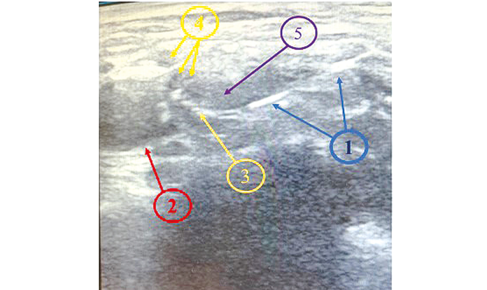 Рис. 1. Ультразвуковая картина распространения раствора натрия хлорида, введённого через катетер, установленный к плечевому сплетению надключичным доступом через проводниковую иглу Туохи. Примечание. 1 — игла Туохи, 2 — подключичная артерия, 3 — катетер, 4 — плечевое сплетение, 5 — раствор натрия хлорида.