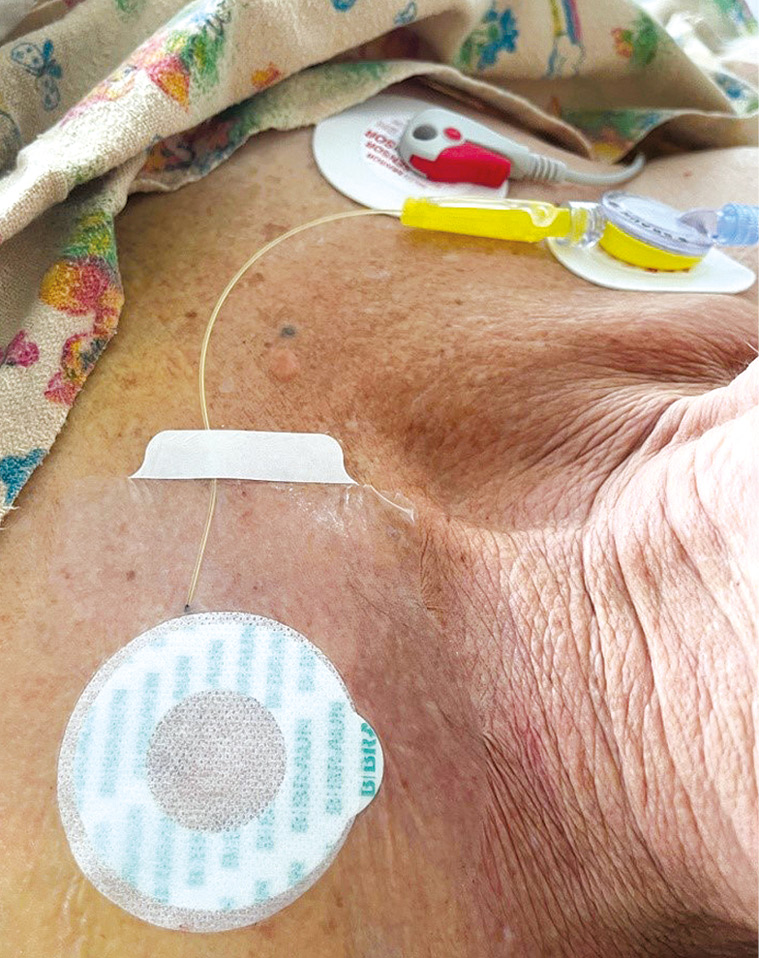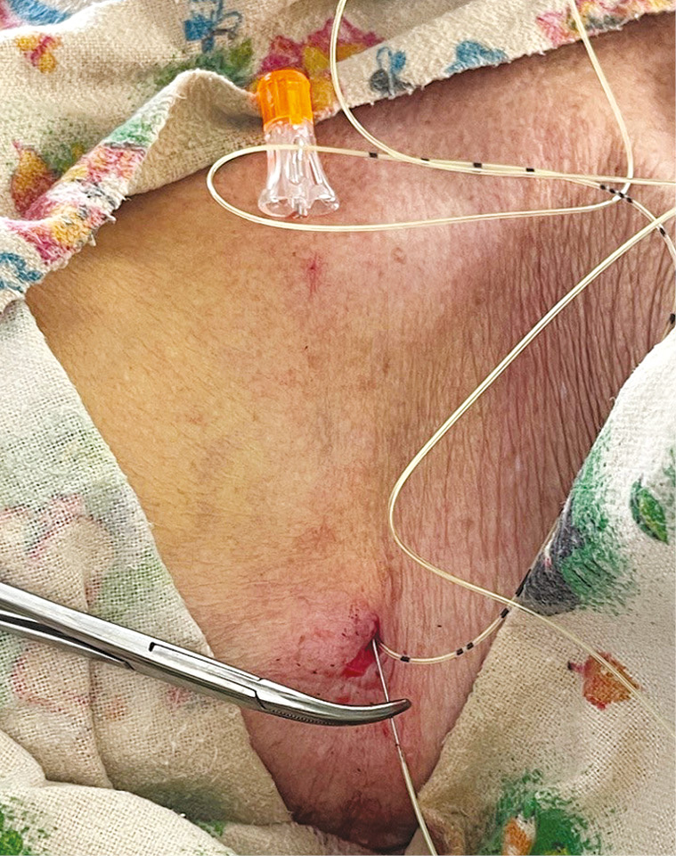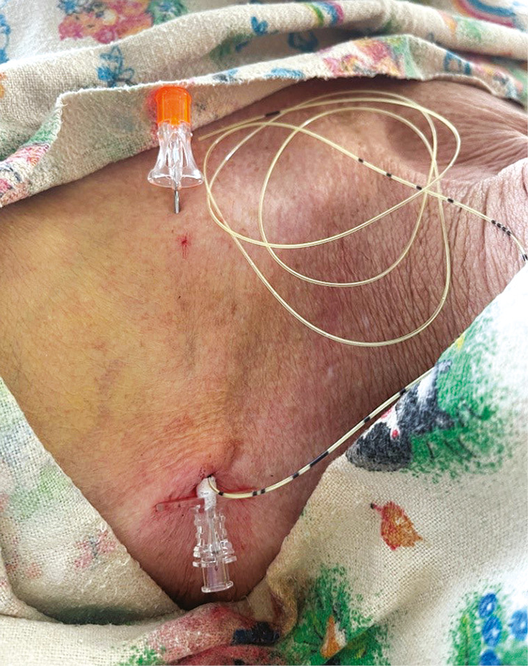 Рис. 4. Катетер проведён и фиксирован под кожей подключичной области на стороне блокады, а проксимальный конец катетера — на противоположной стороне.