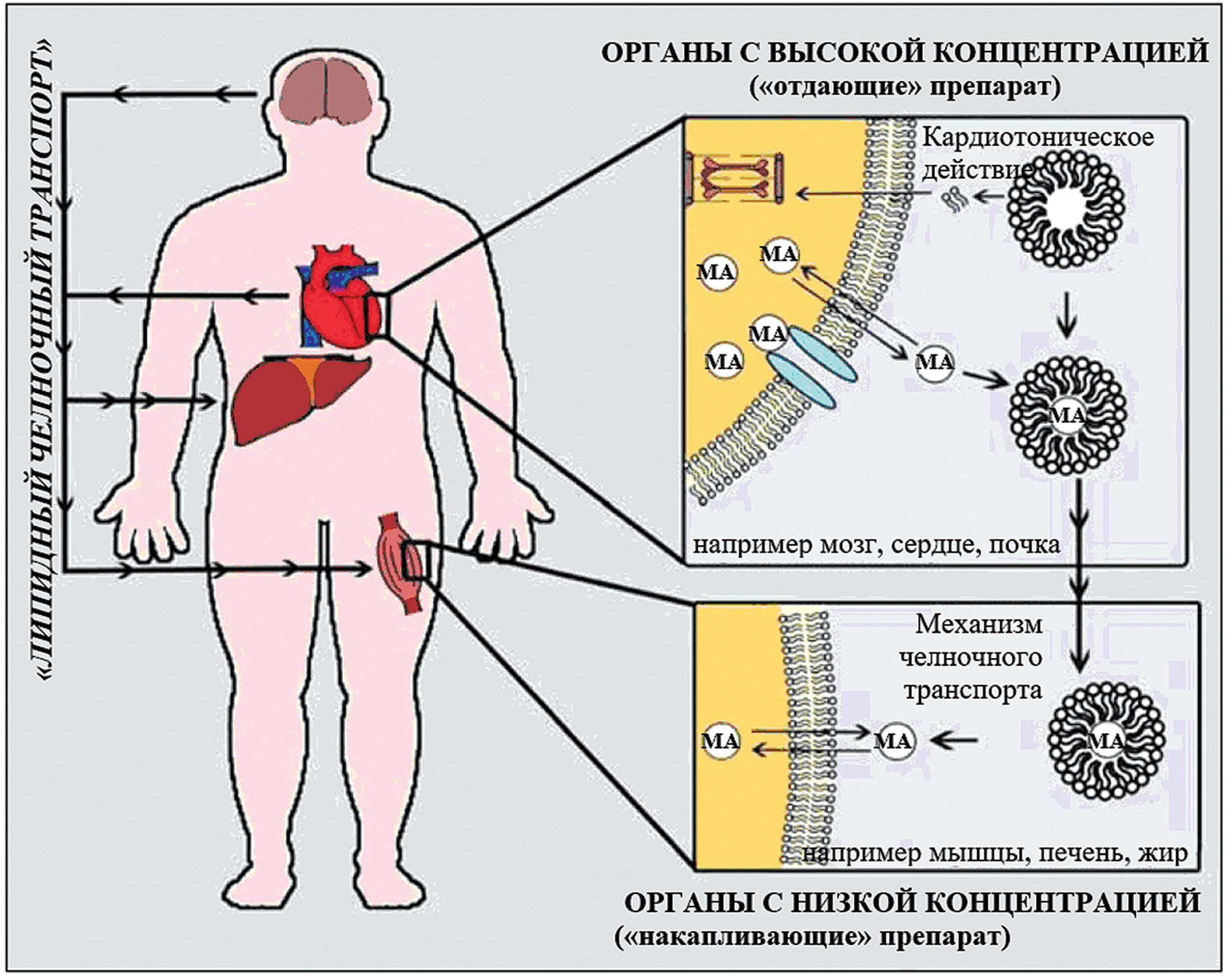 Результаты современных исследований свидетельствуют о том, что молекулы жировой эмульсии выполняют функцию не статического липидного поглотителя, а скорее, динамического носителя, который захватывает молекулы МА из активно кровоснабжаемых и наиболее чувствительных к СТМА органов (т. е. сердце и головной мозг) и перемещает их в органы, накапливающие и обезвреживающие препарат (т. е. соответственно мышцы и печень) (см. рис.). Точный механизм связывания молекул МА с жировыми каплями не полностью ясен, однако считается, что это комбинированное действие термодинамических эффектов, в частности электростатическое притяжение, и физико-химические характеристики — липофильность и кислотно-основная диссоциация, т. к. положительно заряженные жирорастворимые молекулы анестетика связываются с негативно заряженными липидными частицами [11].