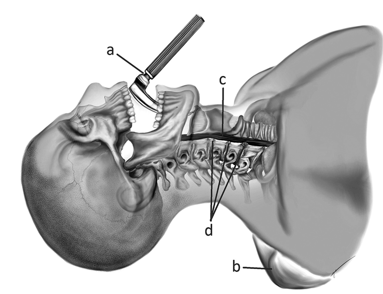 Рис. 1. Положение пациента при операции гемитиреоидэктомии: а) положение ларингоскопа при интубации трахеи; b) расположение валика при операции гемитиреоидэктомии; c) пищевод; d) остеофиты на телах шейных позвонков