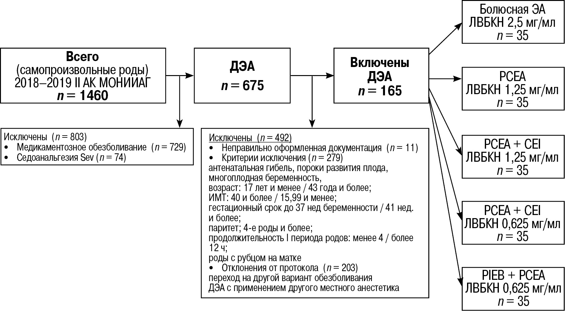 Рис. 1. Блок-схема участников исследования (ДЭА – длительная эпидуральная анальгезия; Болюсная ЭА – болюсная эпидуральная анальгезия, вводимая медперсоналом; PCEA – patient-controlled epidural analgesia; PCEA + CEI – patient-controlled epidural analgesia + continuous epidural analgesia; PIEB + PCEA – programmed intermittent epidural bolus + patient-controlled epidural analgesia; ЛВБКН – левобупивакаин)