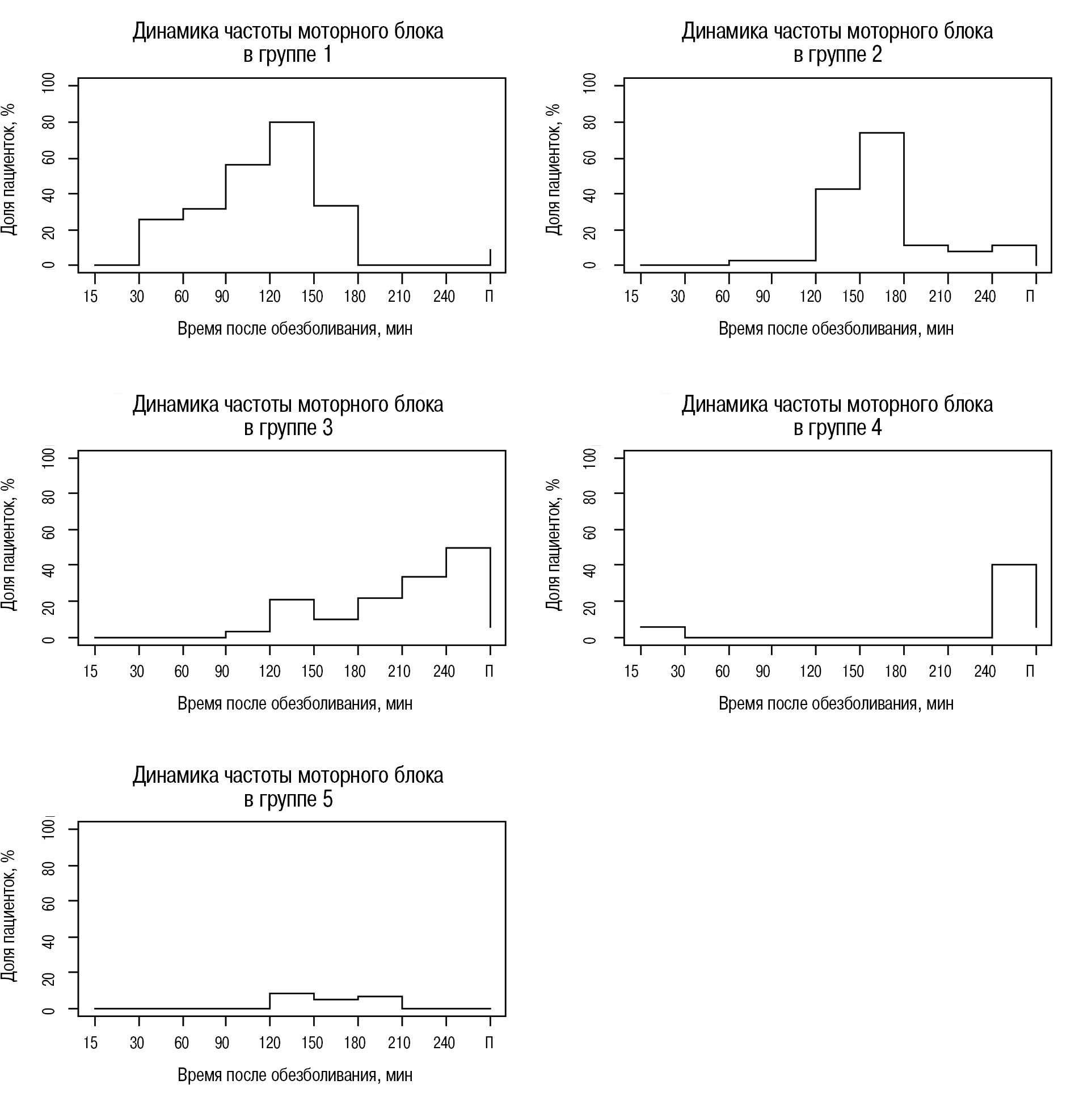 Исследование частоты МБ по шкале Bromage показало, что во всех группах на всех этапах исследования данная оценка принимала значения 0 или 1. Оценка по шкале Bromage, равная 1, была принята за наличие МБ (пациентка может поднять и удерживать согнутую в колене ногу, однако не может встать и ходить), «0» рассматривалась как его отсутствие. По истечению 6,5 ч (270 мин) от начала обезболивания количество пациенток в группах было недостаточно для статистической обработки, постольку этап «полного открытия шейки матки» у большинства включённых в исследование наступал раньше указанного временного промежутка, поэтому эти данные были исключены из исследования. Абсолютная частота МБ была равна количеству пациенток в группе, которые на конкретном этапе исследования имели 1 балл по шкале Bromage, относительная частота рассчитывалась как отношение абсолютной частоты к общему количеству пациенток в данной группе, отмеченных на данном этапе исследования. Поскольку число пациенток в группе сокращалось по мере удаления от начальной временной точки, то общее количество пациенток в каждой группе также оценивалось на каждом этапе исследования. Полученные результаты были использованы для расчёта относительной частоты МБ на каждом этапе исследования внутри каждой группы пациенток. Относительная частота МБ была введена для того, чтобы можно было корректно сравнить динамику частоты МБ между группами в течение всего периода наблюдения. В абсолютных числах это сделать нельзя, поскольку общий объём групп сокращается в процессе исследования с разной скоростью. Динамика относительной частоты МБ во всех 5 группах представлена на рис. 2.