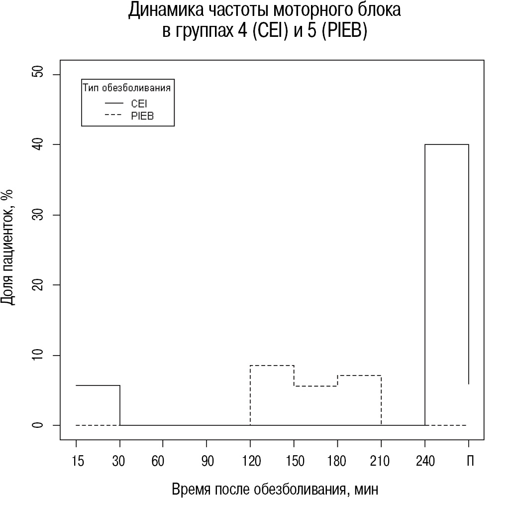 Сравнение динамики относительных частот между группами 4 (PCEA + CEI) и 5 (PCEA + PIEB), для обезболивания которых использовалась минимальная концентрация левобупивакаина (0,625 мг/мл), представлено на рисунке 3.