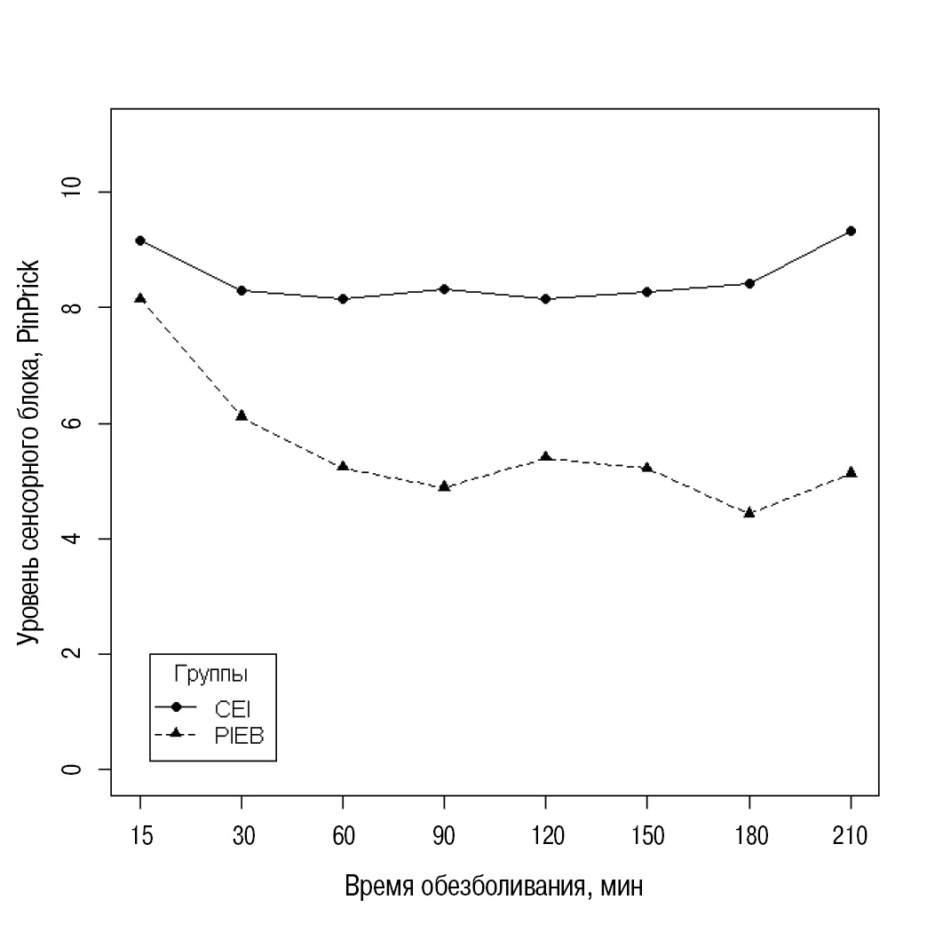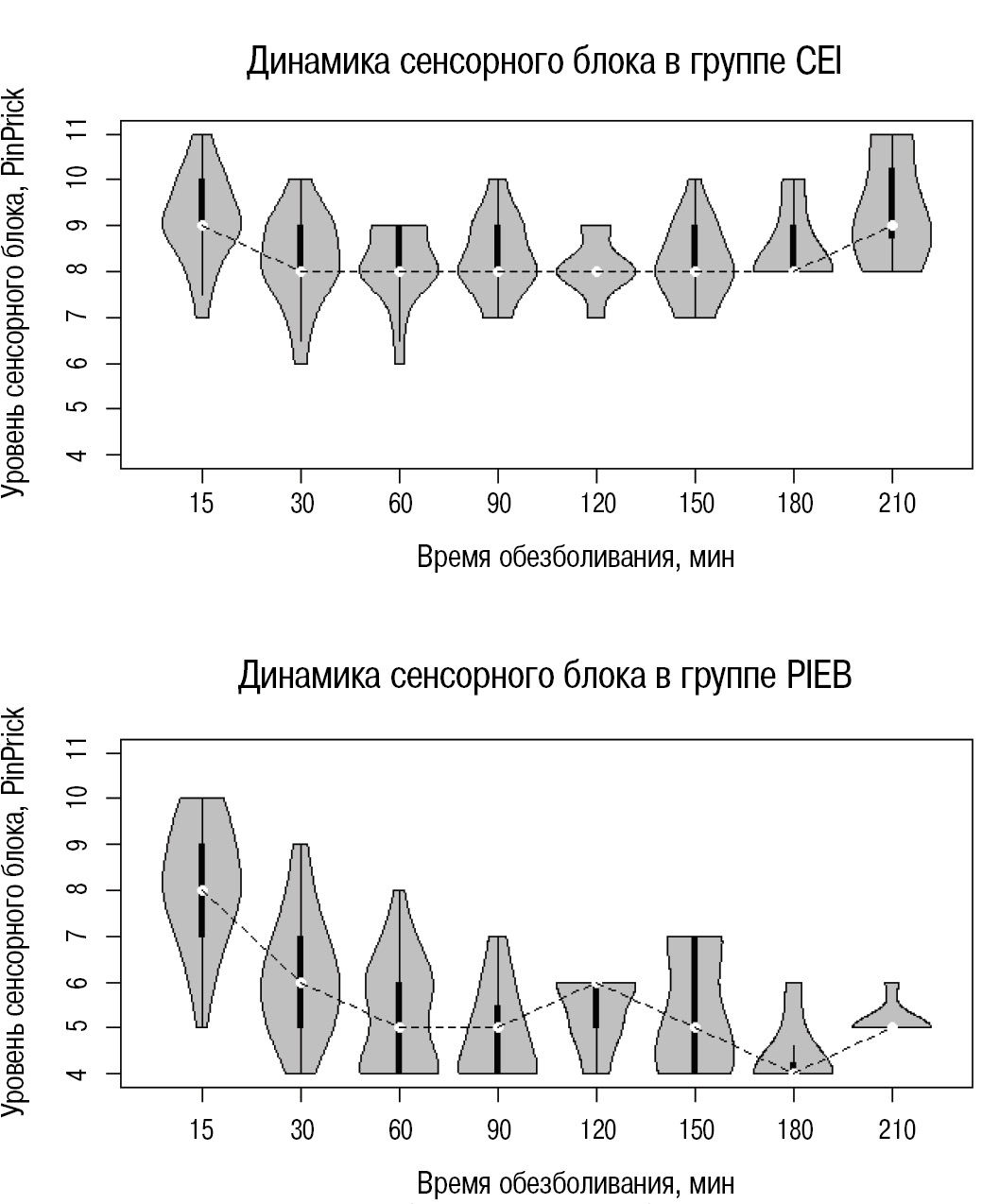 Графики динамики распределений уровня сенсорного блока в группе CEI и PIEB (рис. 5) показывают, что начиная со 120-й мин значения сенсорного блока у пациенток в группе CEI не поднимались выше уровня Th7, тогда как в группе PEIB они не опускались ниже указанного уровня в этих же временных точках.