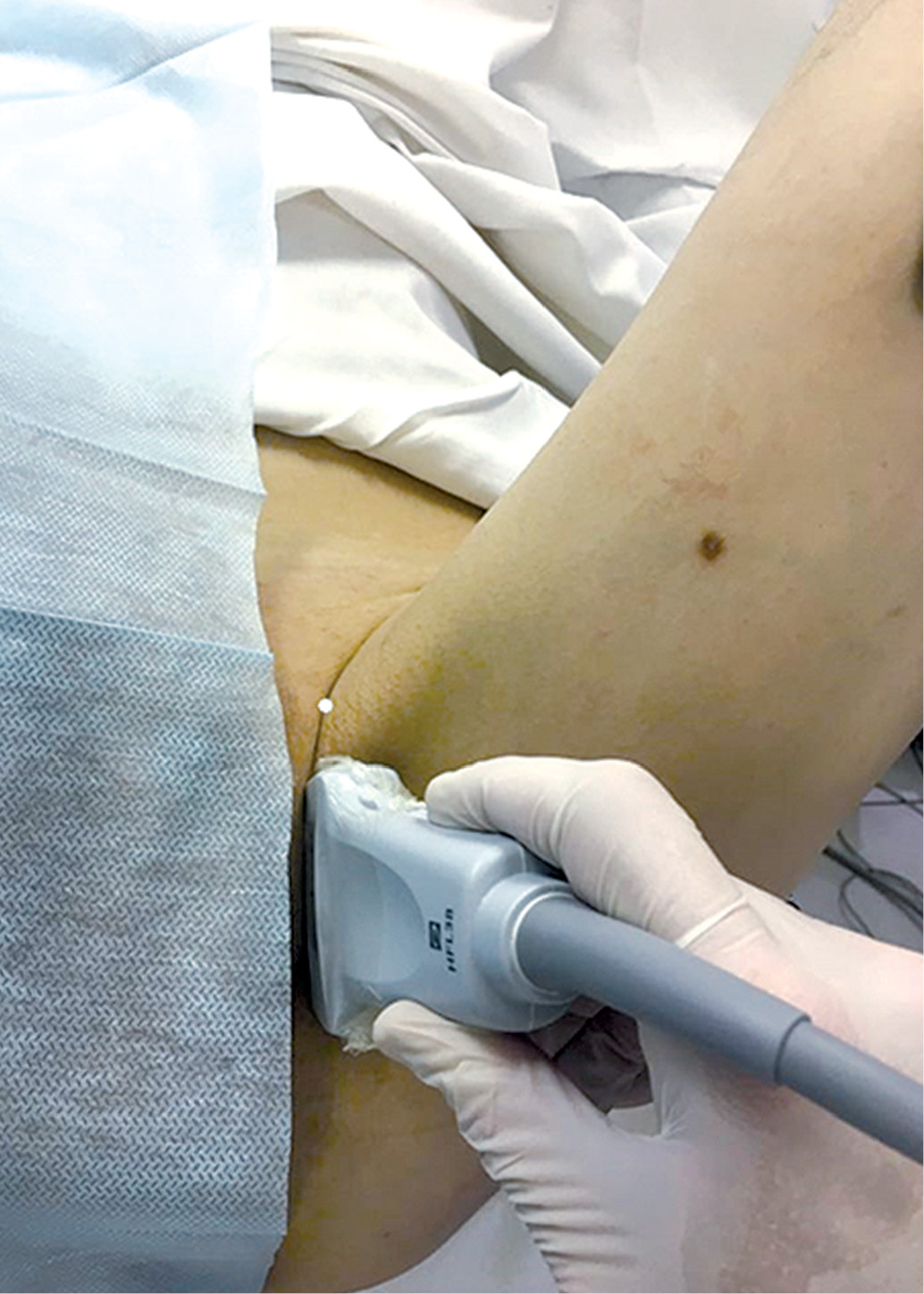 Рис. 2. Установка ультразвукового датчика. Место пункции на 1,5–2 см выше передней поверхности датчика (белая точка)