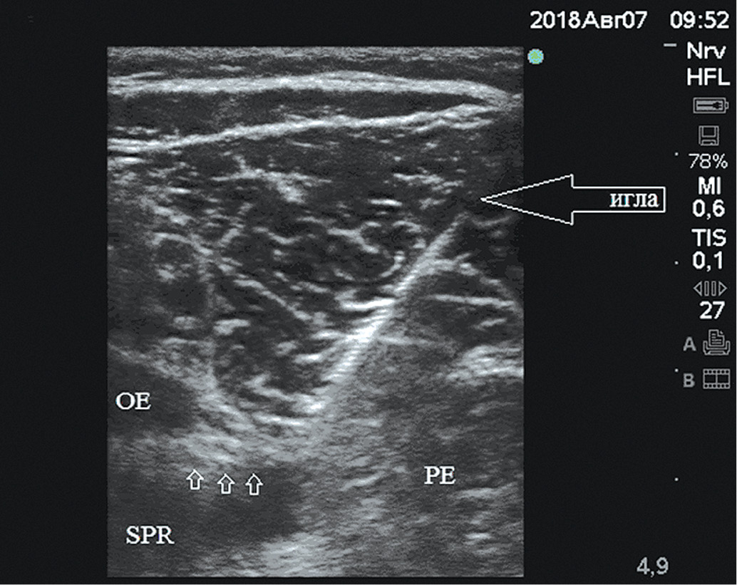 Рис. 3. Ультразвуковая картина блокады запирательного нерва: нерв обозначен стрелками. SPR – верхняя ветвь лобковой кости, OE – наружная запирательная мышца, PE – гребенчатая мышца