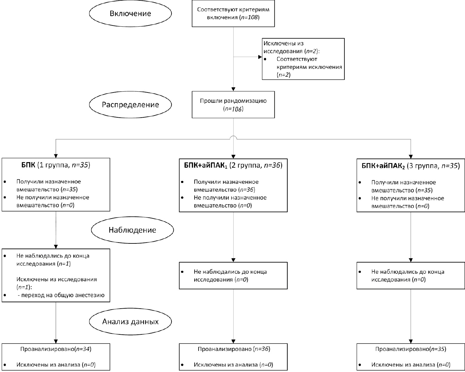 С апреля по декабрь 2022 года на базе университетской клиники ФГБОУ ВО ПИМУ (Нижний Новгород) был произведён отбор соответствующих критериям включения пациентов в числе 108 человек. Два человека выбыли из исследования перед этапом распределения. 106 пациентов в зависимости от метода выполнения регионарного блока были разделены методом простой рандомизации на 3 группы по 35–36 человек.