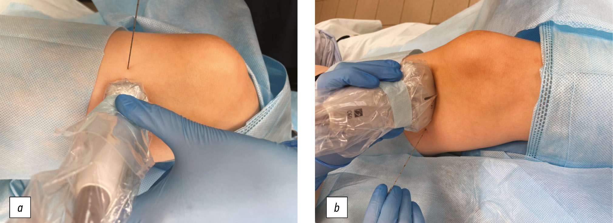 Для выполнения айПАК-блока проксимальным способом датчик располагали на 2 пальца выше надколенника. После визуализации мыщелков бедренной кости датчик перемещали проксимальнее до тех пор, пока они не сменятся диафизом бедренной кости. На этом уровне визуализировали подколенную артерию и выполняли вкол иглы по верхнему краю датчика под углом 45 ° в медиально-латеральном направлении. Конец иглы позиционировали между подколенной артерией и диафизом бедренной кости. После выполнения аспирационной пробы вводили 20 мл подготовленного раствора, постепенно извлекая иглу (рис. 2, а).