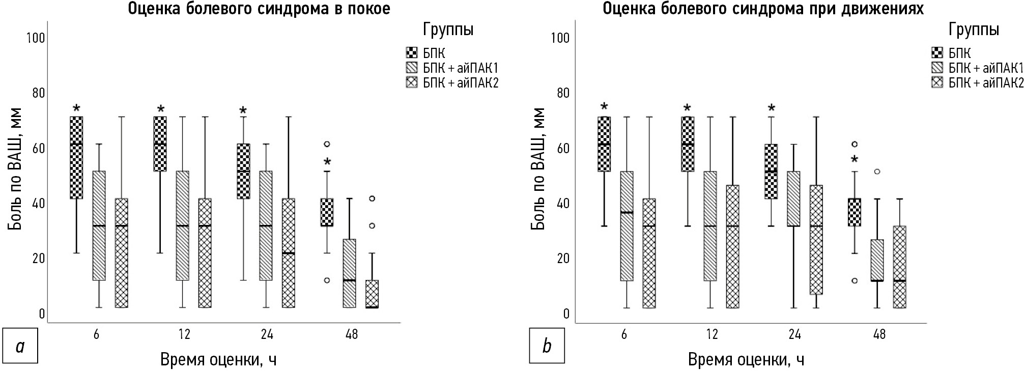 Рис. 3. Оценка болевого синдрома по визуальной аналоговой шкале. Примечание. a — в покое, b — при движениях; * p <0,05.