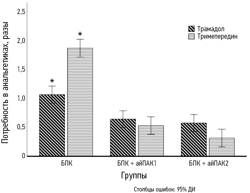 Рис. 4. Потребность в анальгетиках в первые послеоперационные сутки. Примечание (здесь и на рис. 5). * p ˂0,05.