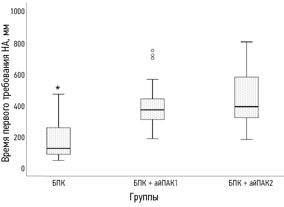 Средняя послеоперационная потребность в трамадоле и тримеперидине была выше в группе БПК, чем в группах БПК + айПАК1 и БПК + айПАК2 (100,00 [100, 00; 100, 00] против 100,00 [0, 00; 100, 00] мг трамадола во II и III группах, p1,2=0,000, p1,3=0,000; 40,00 [20, 00; 40, 00] против 20,00 [0, 00; 20, 00] и 0,00 [0, 00; 20, 00] мг тримеперидина во II и III группах соответственно, p1,2=0,000, p1,3=0,000; (рис. 4). Не нуждались в наркотических анальгетиках 47,22±8,32% (n=17) и 68,57±7,85% (n=24) пациентов групп проксимального и дистального айПАК соответственно. Время до первого требования наркотических анальгетиков было почти в 3 раза больше в группах II и III, чем в группе I (попарное сравнение U-критерием Манна–Уитни — p1,2=0,000, p1,3=0,000; рис. 5).