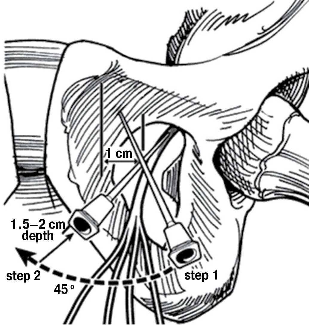 Fig. 2. The needle is withdrawn and redirected laterally and slightly inferiorly and advanced 1.5–2 cms beyond the previously noted depth [25]