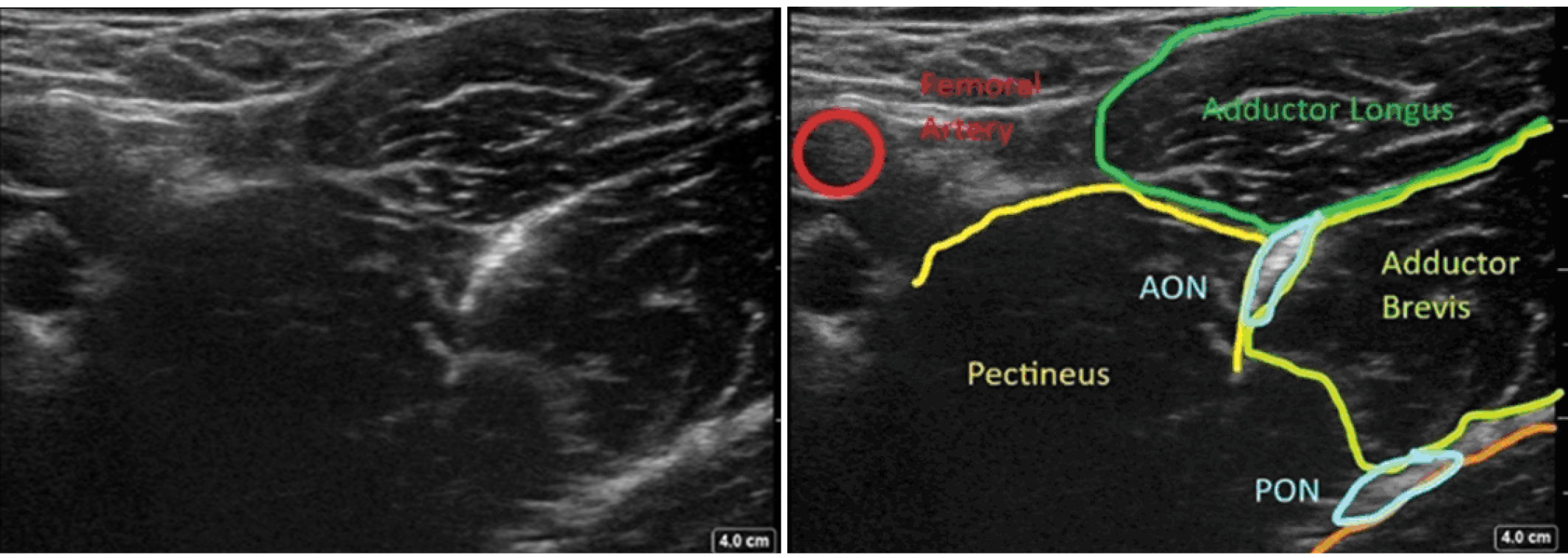 Fig. 4. Distal approach the obturator nerve block with visualization of anterior and posterior divisions of the obturator nerve [18]. AON – anterior division of obturator nerve. PON – posterior division of obturator nerve
