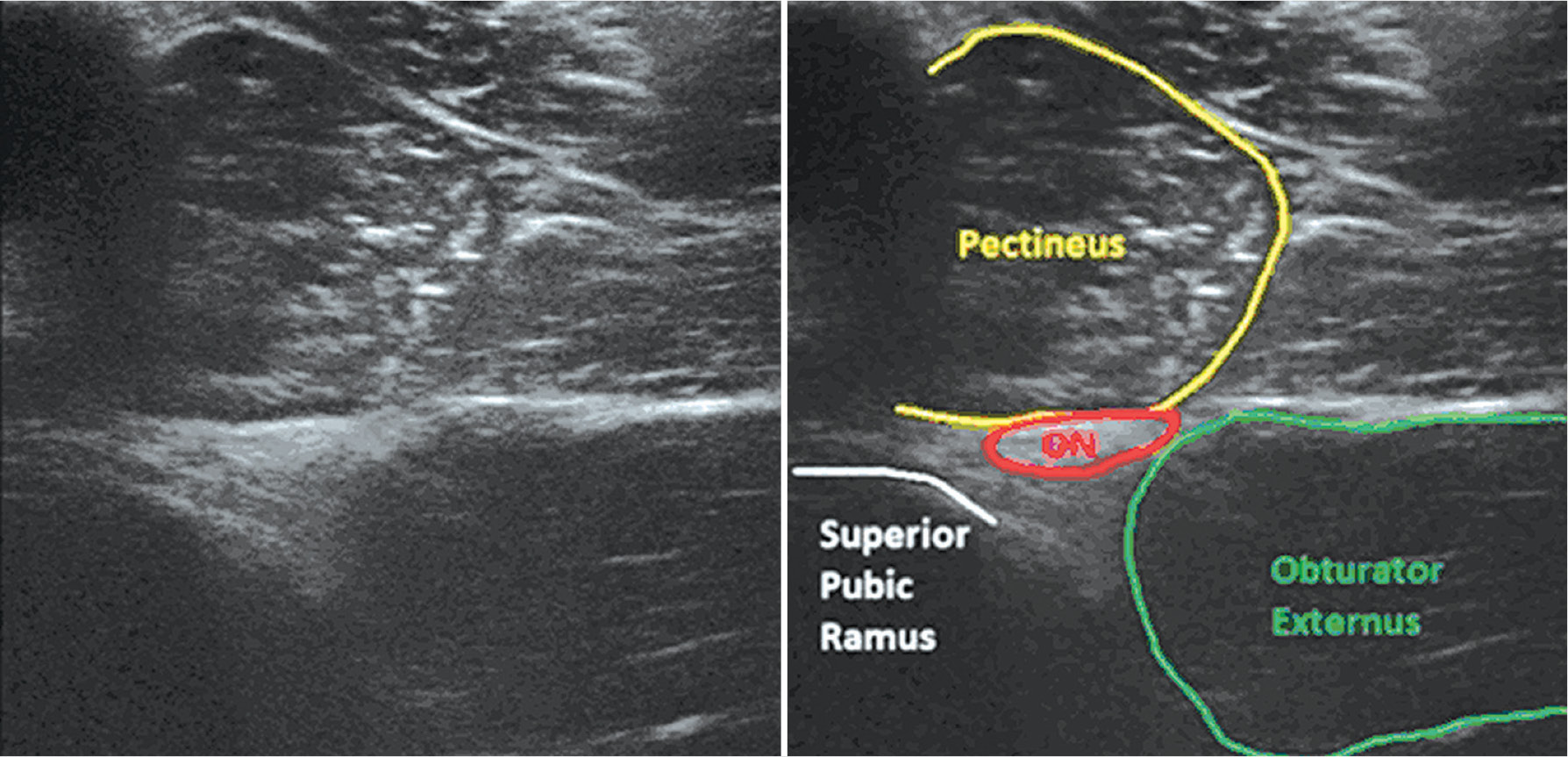 Латеральнее верхней ветви лобковой кости видны гребенчатая и наружная запирательная мышцы. Примечательно, что верхняя ветвь лобковой кости часто совпадает с межфасциальной плоскостью между более поверхностной гребенчатой мышцей и внешней запирательной мышцей. Иглу in plane вводят латерально к медиальному направлению. Иногда запирательный нерв (гиперэхогенная тень) может быть визуализирован сразу. Несмотря на то что запирательный нерв может разделяться проксимальнее этого уровня, а задняя ветвь может проходить через наружную запирательную мышцу [26], введëнный раствор местного анестетика распространяется проксимально и блокирует обе ветви запирательного нерва [29]. При отсутствии визуализации нерва можно ввести 3–4 мл изотонического раствора хлорида натрия, что позволит идентифицировать нервный ствол.
