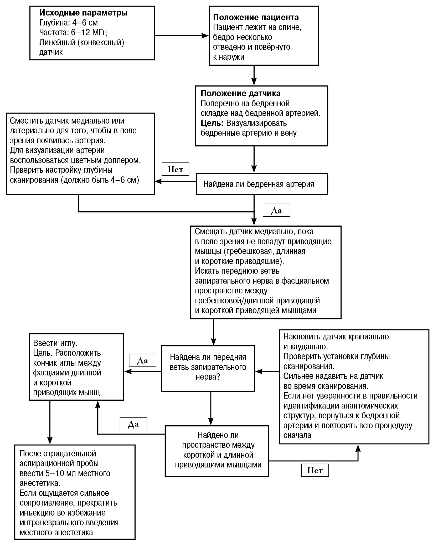 Рис. 7. Алгоритм блокады запирательного нерва с УЗ-навигацией [34]