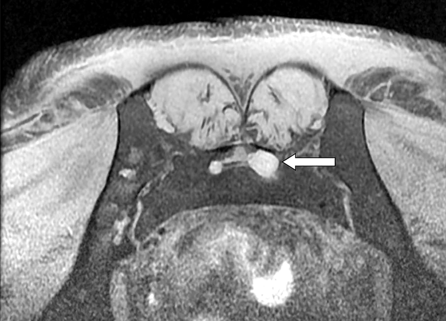 Поражение корешка на уровне S2 позвонка. По данным МРТ (режим Т1) в просвете крестцового канала слева выявляется локальное утолщение корешка 1,1 × 3,0 см с расширением крестцового отверстия и активным накоплением контрастного препарата с быстрым его «вымыванием»