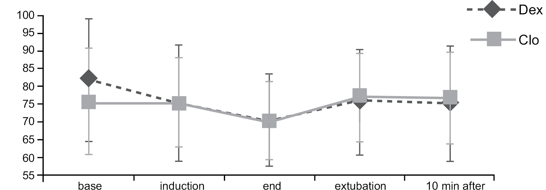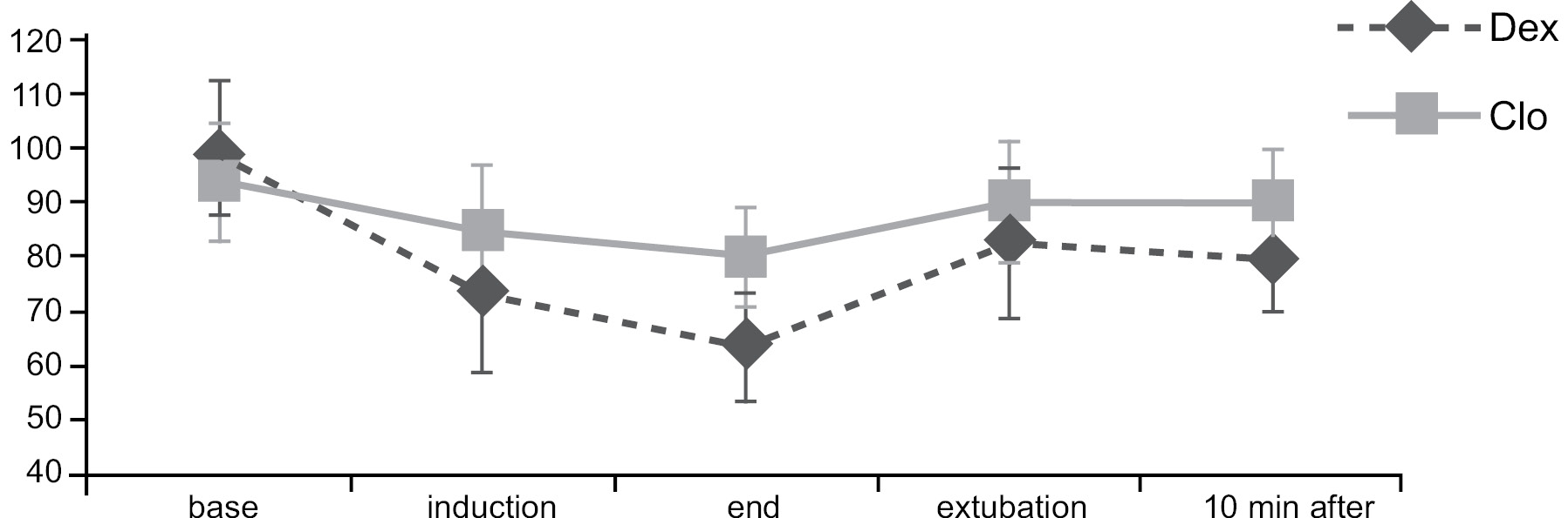 Сразу после пробуждения и экстубации эпизоды гипертензии были зафиксированы в 1 случае в группе Д и 2 случаях в группе К. В группе Д было зафиксировано более выраженное снижение среднего артериального давления (АДср) (рис. 1) и частоты сердечных сокращений (ЧСС) на этапе окончания операции перед пробуждением (63 ± 10,2 мм рт.ст и 70 уд/мин в группе Д и 80 ± 9,2 мм рт.ст; 70 уд/мин в группе К) (рис. 2).
