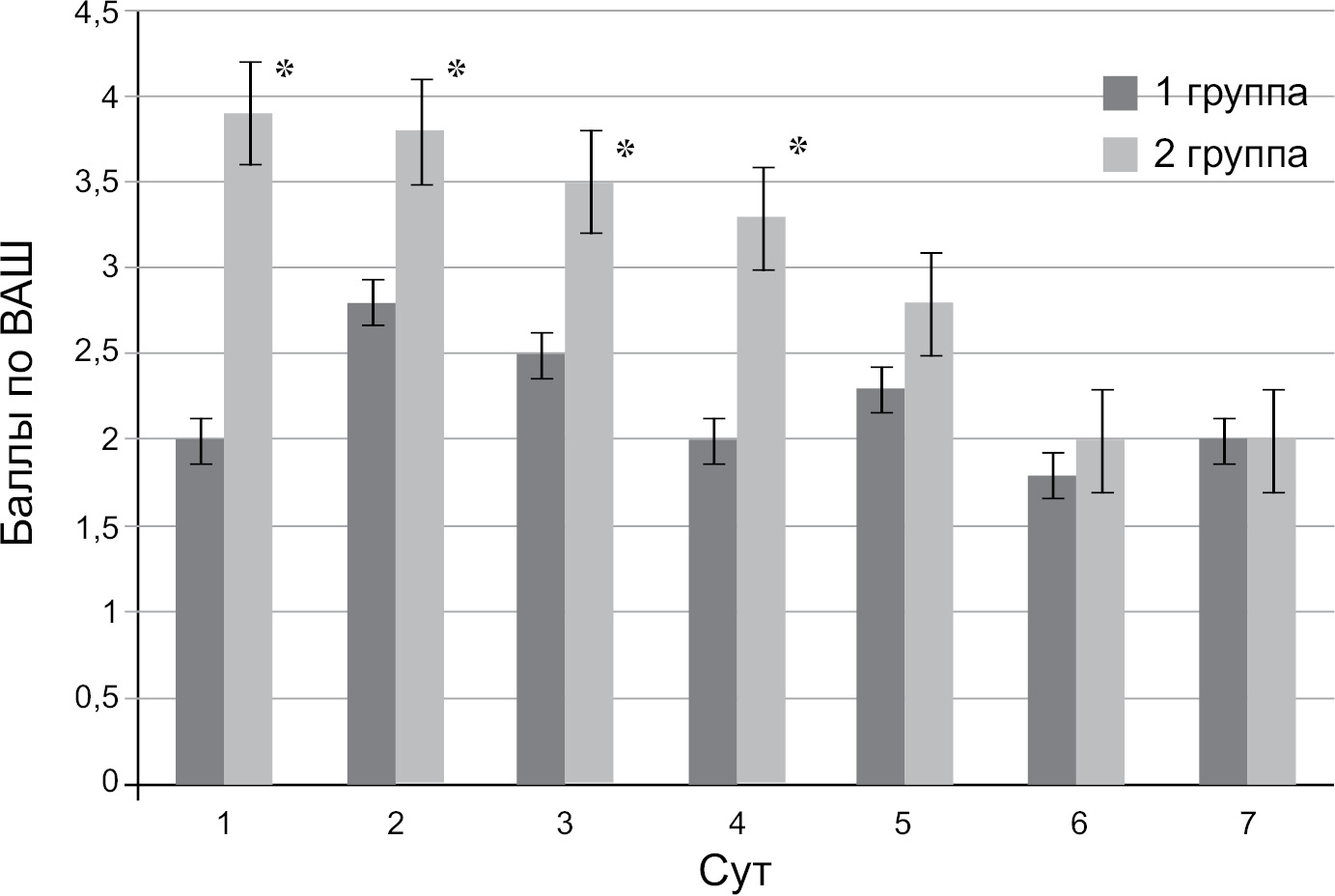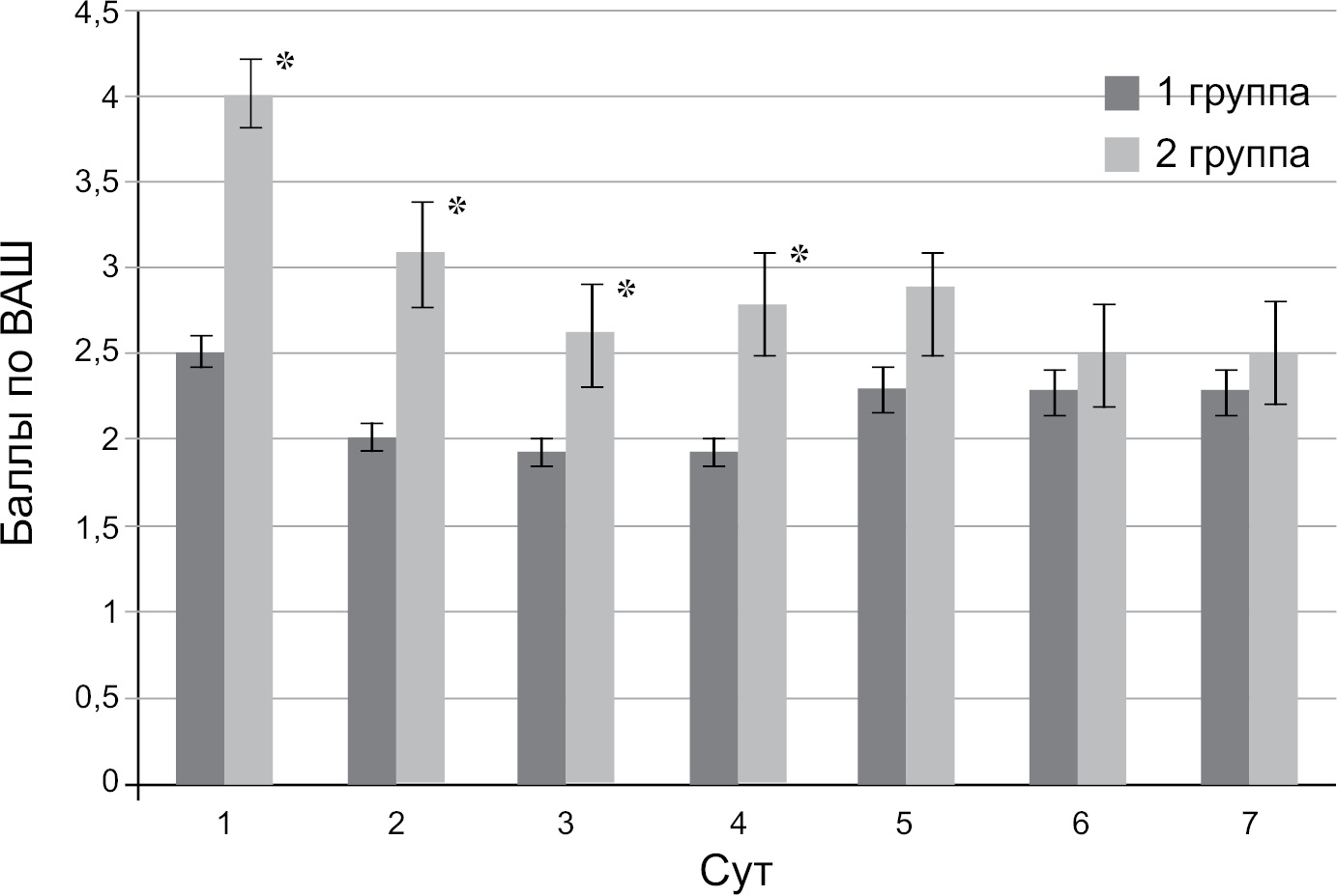 В течение первых 4 сут интенсивность болевого синдрома в покое была более выражена у пациентов 2-й группы (p<0,05). Начиная с 5-х сут, статистически значимых различий между группами не установлено (рис. 1).