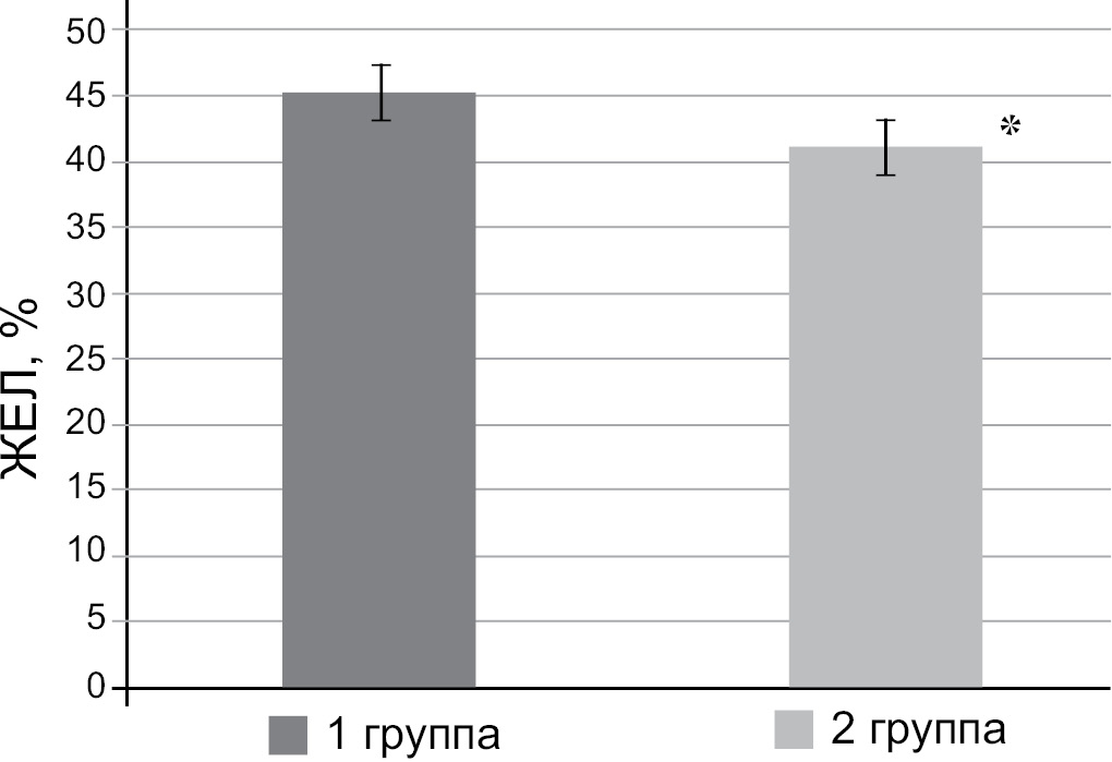 Рис. 3. Величина жизненной емкости легких (M± σ). *р < 0,05 по сравнению с 1-й группой