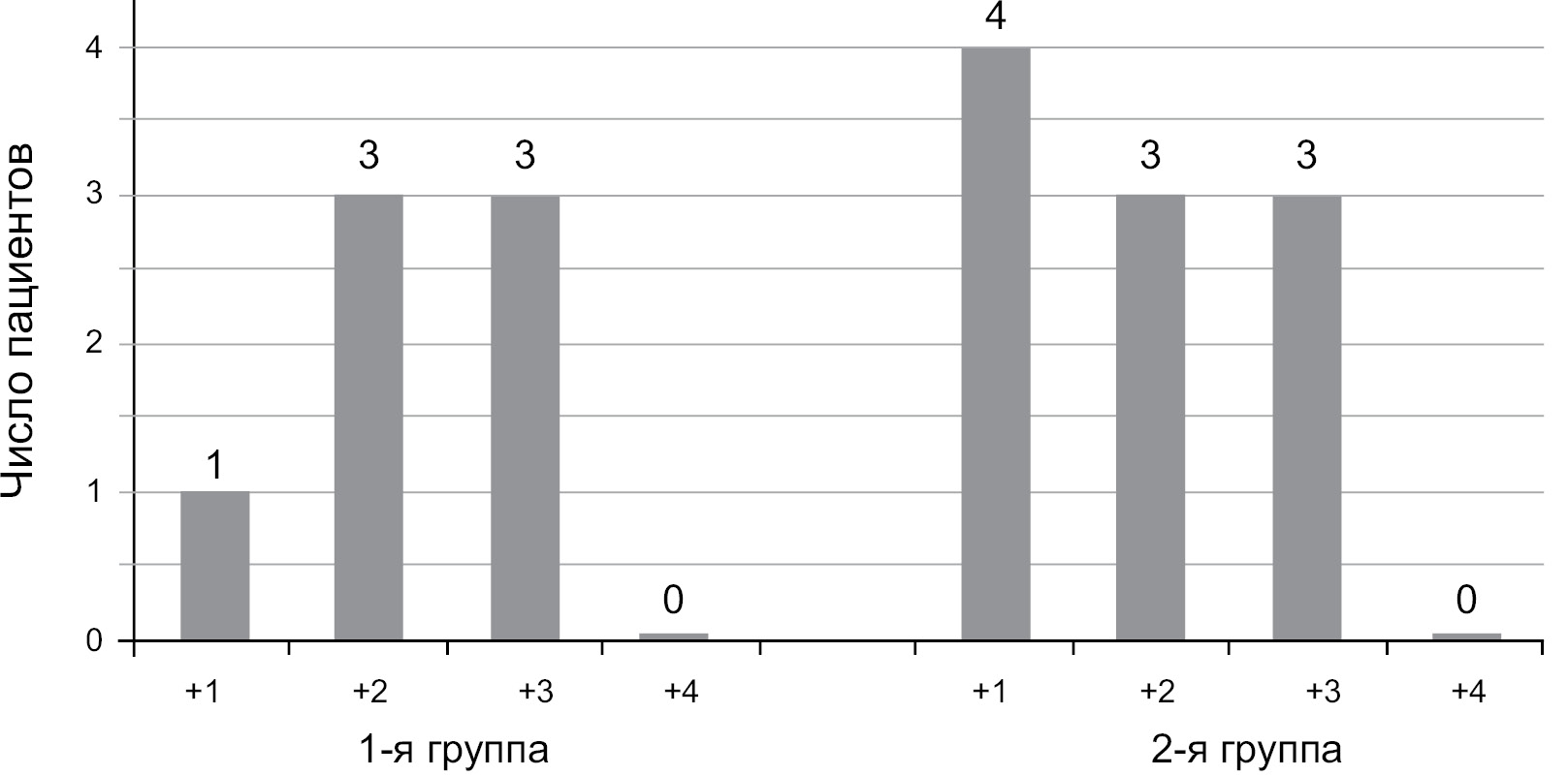 На фоне активизации (выполнение активных и пассивных упражнений) и проведения респираторной гимнастики у 4 (10,8%) пациентов из 1-й группы и 12 (36,4%) пациентов из 2-й группы интенсивность болевого синдрома составляла от 4 до 7 баллов по ВАШ, что требовало дополнительного обезболивания. В этих случаях анальгезия достигалась в 1-й группе болюсным эпидуральным введением 2 мг морфина с последующим увеличением скорости инфузии до 0,6 мг/ч, во 2-й группе делали в/в болюс 50–100 мкг фентанила. После дополнительного обезболивания уровень боли снижался до 2 баллов по ВАШ, что соответствовало оптимальному уровню, позволяющему проводить активизацию и респираторную гимнастику. Уровень интенсивности болевого синдрома при активизации пациентов представлен на рис. 2.