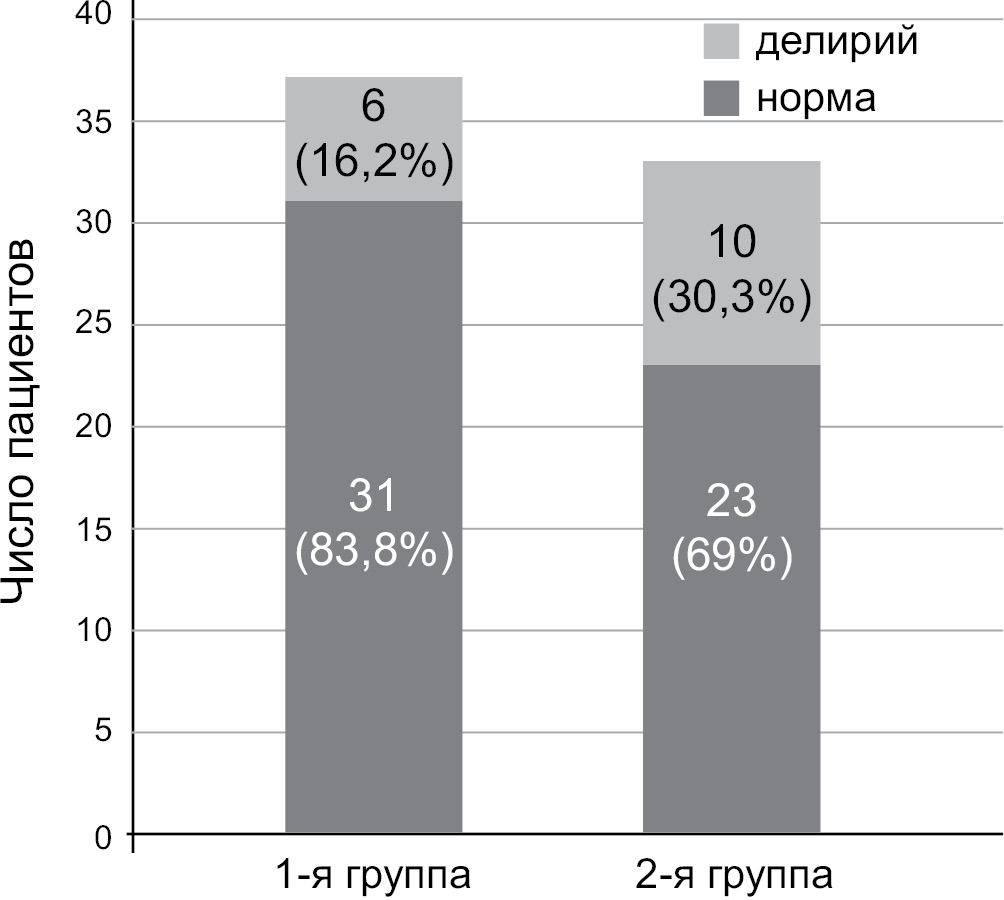 В 1-й группе 6 (16,2%) пациентов имели оценку по шкале RASS +1 и выше и положительную оценку по шкале CAM-ICU (рис. 4). Во 2-й группе послеоперационный делирий развивался достоверно (p < 0,05) чаще – у 10 (30,3%) пациентов (рис. 5). Все случаи делирия фиксировались преимущественно в ночное время суток и требовали медикаментозной коррекции, которая достигалась в/в инфузией дексмедетомидина в дозе 0,2-0,7 мкг/кг*ч или в/м введением от 10 до 30 мг/сут галоперидола.