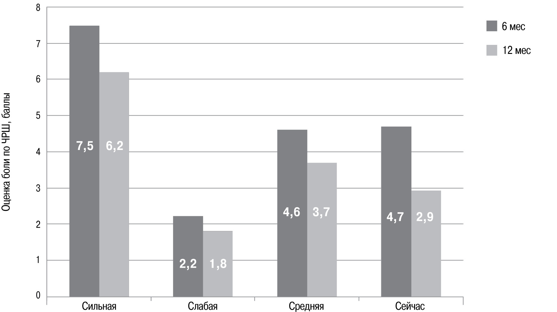 Хроническая боль всё чаще признаётся проблемой у лиц, переживших критическое состояние [5]. Существуют противоречивые данные о частоте возникновения хронической боли. Результаты нашего исследования свидетельствуют, что половина всех респондентов всё ещё испытывает боль, по крайней мере через 6 и 12 мес после выписки из ОИТ. Это согласуется с исследованием немецких коллег, в котором сообщалось, что 56% пациентов сообщали о боли через 2 года после выписки из ОИТ [3]. По нашим данным, через 12 мес количество пациентов, страдающих от боли, несколько увеличилось. Если провести сравнение с ХПОБ, то, по данным многих исследователей, частота хронической послеоперационной боли снижается со временем. Но это утверждение, возможно, не совсем верно применять к ХБПИТ.