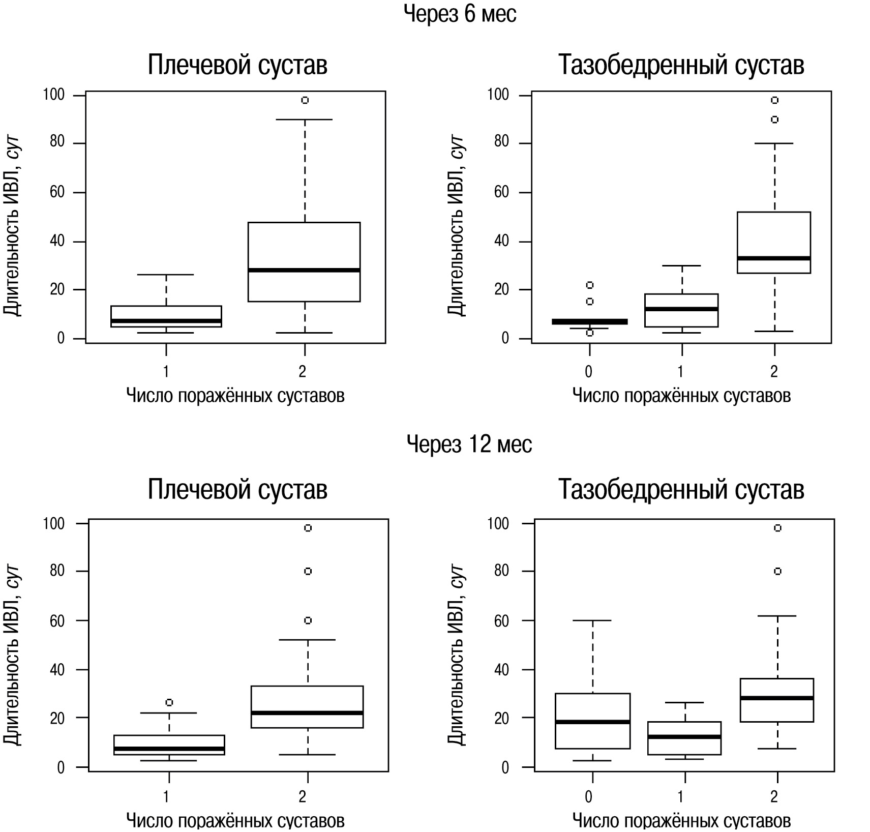 Согласно рис. 3 тенденция влияния длительности ИВЛ на число поражённых суставов сохранялась и через 12 мес после перенесённого критического состояния.
