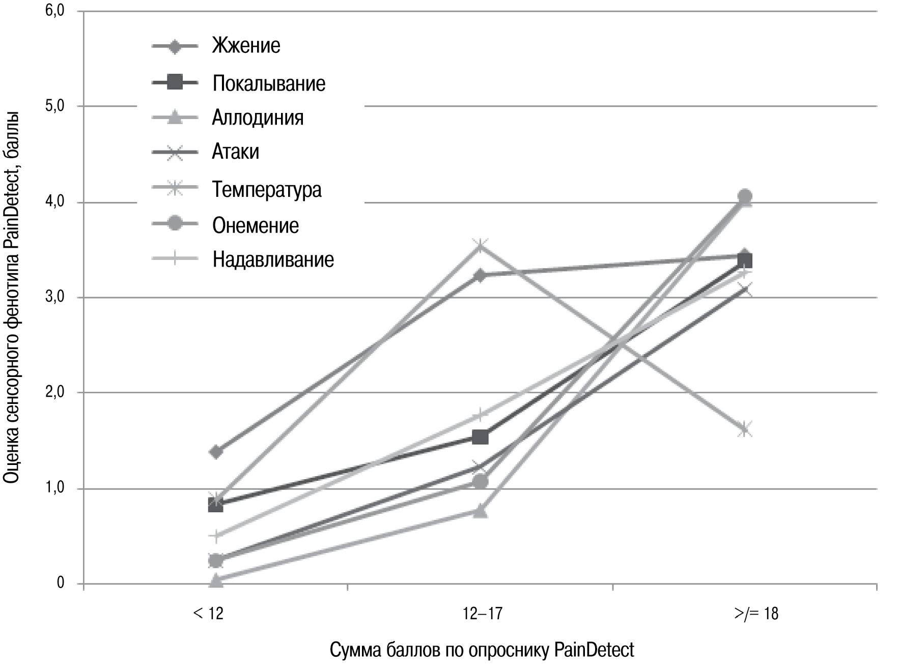 Рис. 4. Взаимосвязь оценок сенсорных фенотипов PainDetect и суммы баллов по опроснику